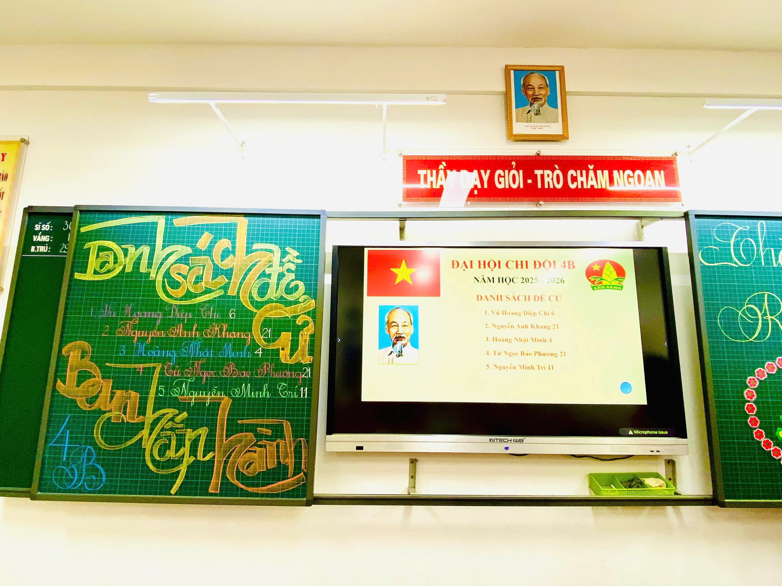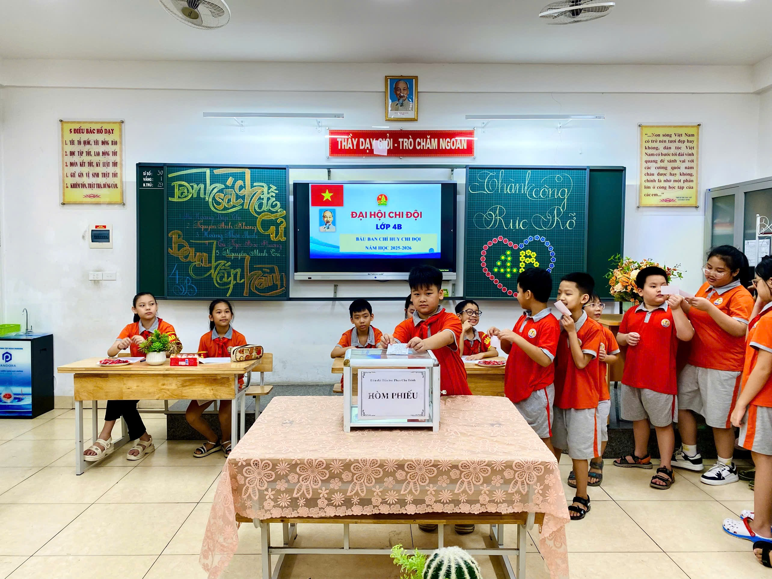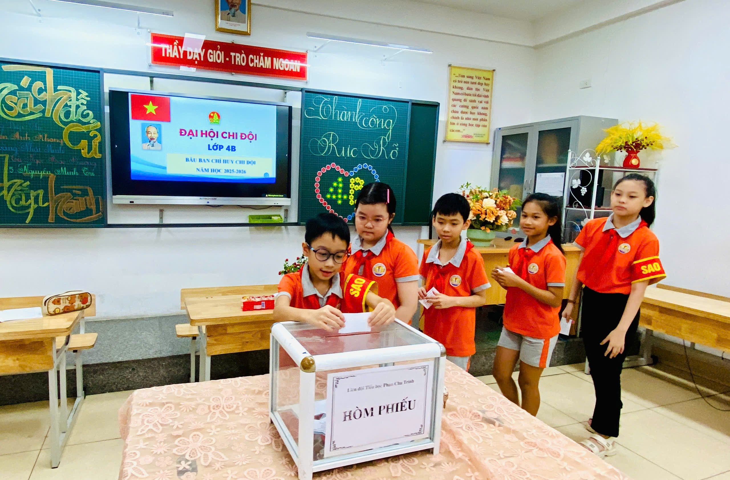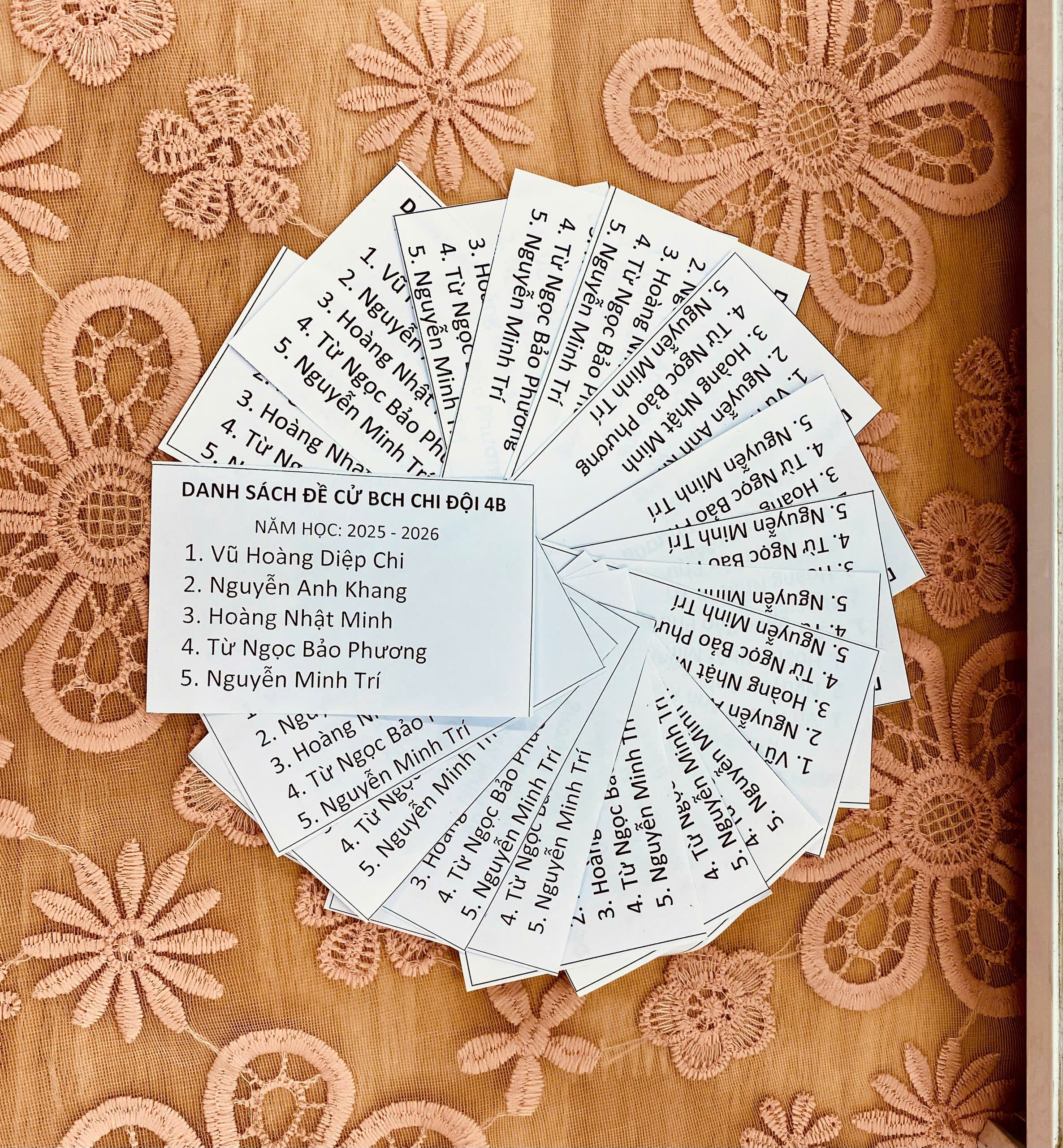 Sau phần phát biểu ý kiến hết sức sôi nổi, đại hội chuyển sang phần Bầu ban chỉ huy chi đội mới nhiệm kì 2025 - 2026. Quá trình bầu cử được diễn ra nghiêm túc, khẩn trương. Các đội viên trong lớp thực hiện bỏ phiếu và bầu cử công tâm, minh bạch. Trong khi Ban bầu cử đang kiểm phiếu, Đại hội đã được thưởng thức những tiết mục văn nghệ, trò chơi vô cùng sôi động đến từ Chi Đội lớp 4B. Dưới sự làm việc công tâm và nghiêm túc, Đại hội đã thành công và bầu ra 03 Đội viên là những gương mặt xuất sắc, đáng tin cậy vào Ban Chỉ huy Chi Đội nhiệm kì 2025 - 2026.
