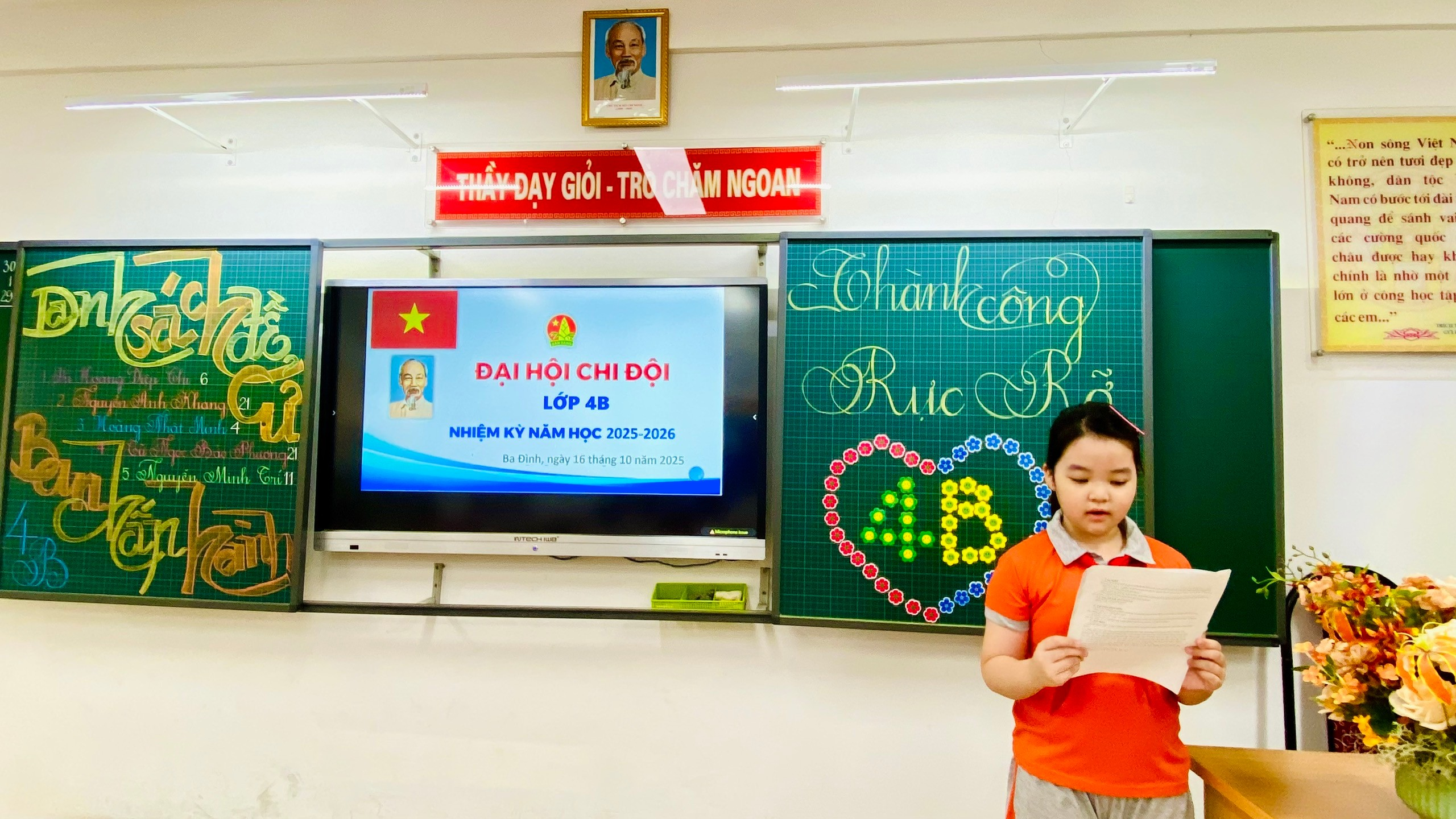 Đại hội diễn ra trong không khí trang trọng, với sự chuẩn bị kĩ càng đến từ Chi Đội 4B. Tại Đại hội, các bạn đội viên đã được nghe đoàn chủ tịch trình bày bản Báo cáo thành tích năm học 2024 – 2025 và Bản Phương hướng hoạt động Đội năm học 2025 – 2026. Đồng thời Đại hội cũng đã bầu ra Ban chỉ huy Chi đội nhiệm kỳ 2025 – 2026.
