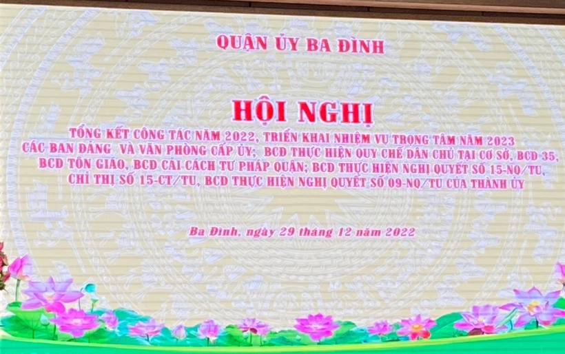 Chiều ngày 29 tháng 12 năm 2022, tại Hội trường UBND quận Ba Đình, Quận ủy Ba Đình tổ chức Hội nghị Tổng kết công tác năm 2022, triển khai nhiệm vụ trọng tâm năm 2023 các Ban Đảng và Văn phòng cấp ủy, BCĐ 35, BCĐ tôn giáo, BCĐ thực hiện Quy chế dân chủ tại cơ sở, BCĐ Cải cách tư pháp quận: BCĐ thực hiện Nghị quyết số 15-NQ/TU, Chỉ thị số 15-CT/TU, BCĐ thực hiện Nghị quyết số 09-NQ/TU của Thành ủy.