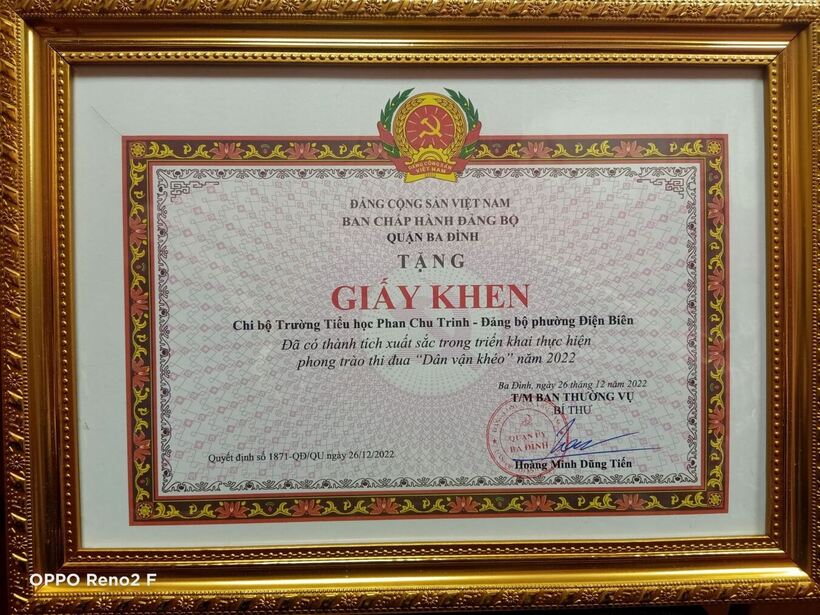 Tại Hội nghị, Chi bộ trường TH Phan Chu Trinh vinh dự là một trong 32 tập thể được khen thưởng: Đã có thành tích xuất sắc trong triển khai thực hiện phong trào thi đua “ Dân vận khéo” năm 2022 theo Quyết định số 1871- QĐ/QU ngày 26/12/2022 của Ban thường vụ Quận ủy Ba Đình.