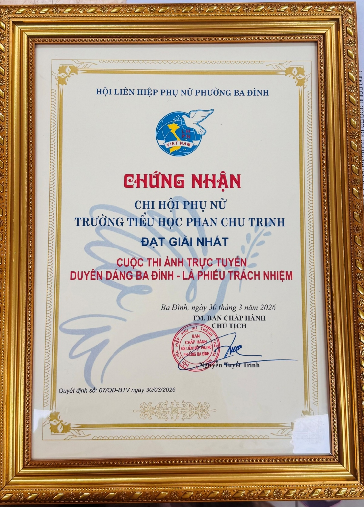 Chi hội Phụ nữ Trường Tiểu học Phan Chu Trinh vinh dự đạt Giải Nhất Cuộc thi ảnh “Duyên dáng Ba Đình – Lá phiếu trách nhiệm”. Thành tích là dấu ấn đẹp của tập thể nữ cán bộ, giáo viên nhà trường trong các hoạt động hưởng ứng Ngày hội bầu cử Đại biểu Quốc hội khóa XVI và Đại biểu HĐND các cấp nhiệm kỳ 2026 – 2031.