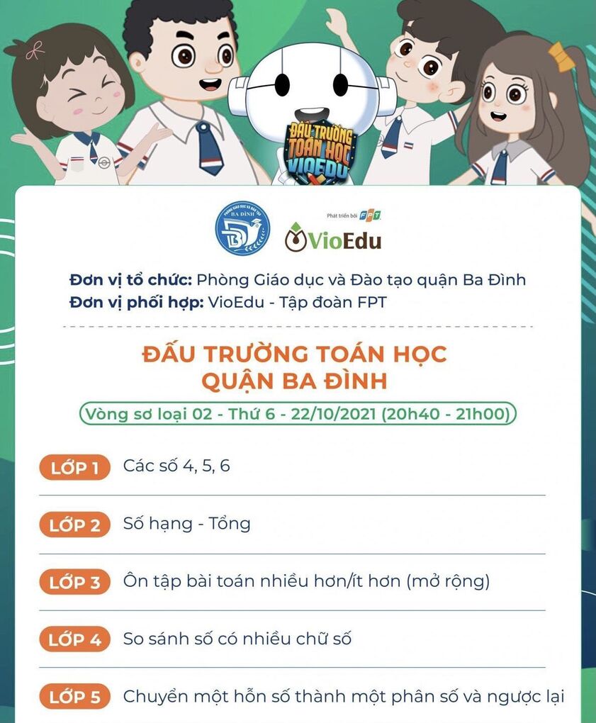 Trận 2 vòng Sơ loại Đấu trường Toán học quận Ba Đình sẽ diễn ra vào 20h40 - 21h tối thứ sáu (22/10/2021). Các con học sinh trường Tiểu học Phan Chu Trinh hãy ôn tập kiến thức theo chủ đề từng khối lớp thật tốt và sẵn sàng tham gia trận đấu để đạt kết quả cao nhé!