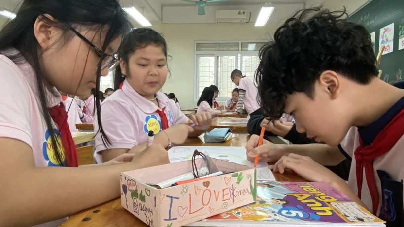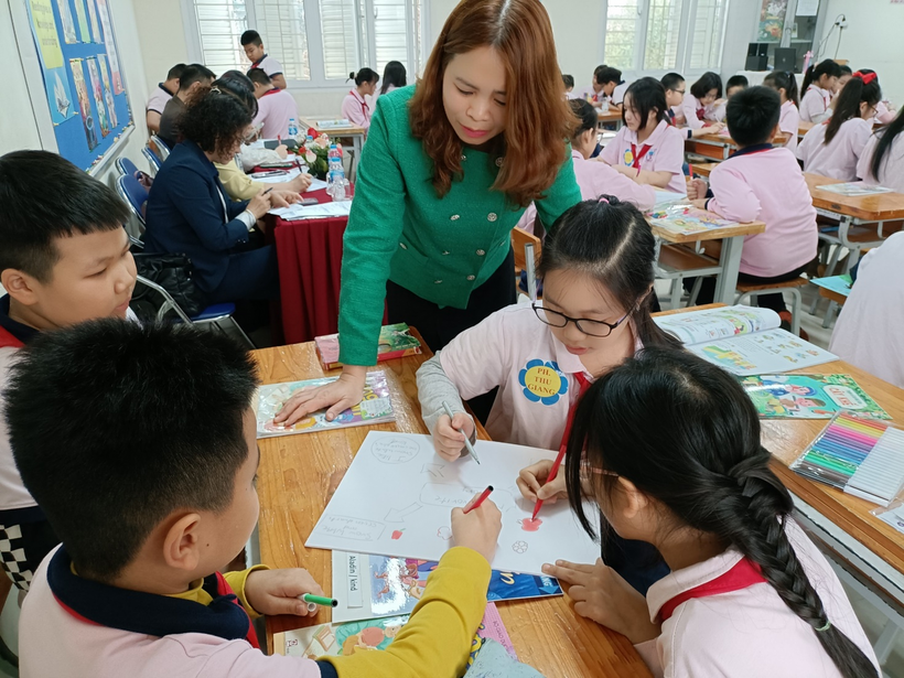 Nhằm giúp học sinh rèn kĩ năng hội thoại, thuyết trình, tư duy tổng hợp, mô hình hóa khi học Tiếng Anh, các hoạt động nhóm được cô giáo Hồng Giang triển khai một cách sáng tạo và hiệu quả. Ngay trong tiết học, các bạn học sinh đã vẽ được sơ đồ tư duy trình bày về cuốn sách mình yêu thích, thể hiện đầy đủ kiến thức về từ mới, mẫu câu đã được học từ tiết học cũng như vận dụng vốn hiểu biết của các em. Các em còn được cô giáo tạo cơ hội thể hiện kĩ năng thuyết trình tự tin của mình qua sơ đồ tư duy được chính các em thiết kế một cách sáng tạo.