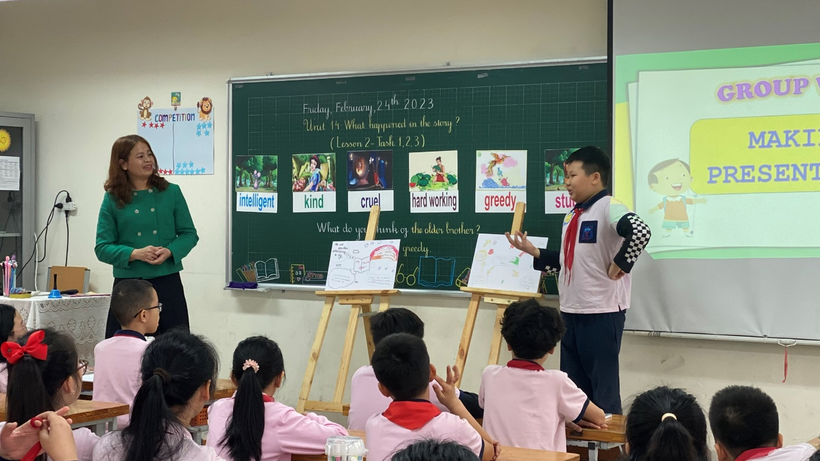 Từ trò chơi “Hidden picture game” đoán tên các câu chuyện quen thuộc, các bạn học sinh được cô giáo nhẹ nhàng dẫn dắt tìm hiểu các từ mới của bài học là những từ miêu tả tính cách của các nhân vật. Xuyên suốt tiết học, dưới sự hướng dẫn, gợi mở của cô giáo học sinh được học, đọc và ghi nhớ các từ mới, mẫu câu bằng nhiều hoạt động, trò chơi học tập phong phú, đa đạng. Cô giáo Đoàn Hồng Giang đã cho học sinh và Ban giám khảo thấy sự tài năng, uyển chuyển trong việc dẫn dắt, lôi cuốn học sinh vào bài học qua từng hoạt động cụ thể.