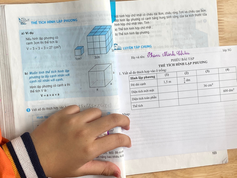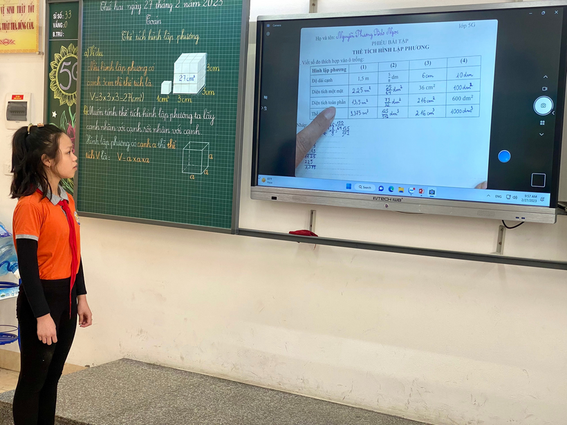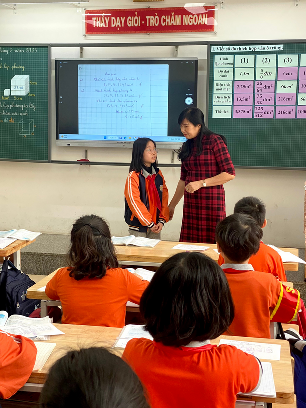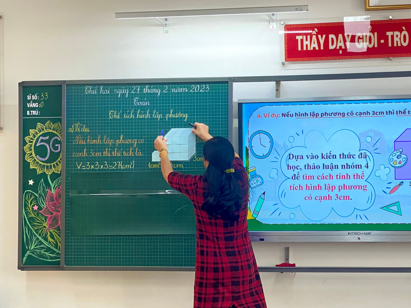 Hoạt động thiết lập công thức tính thể tích hình lập phương được cô Vân Anh gợi mở từ hình hộp chữ nhật quen thuộc với rất nhiều bạn học sinh. Tham gia hoạt động nhóm để tự mình tìm ra kiến thức mới, các bạn học sinh được phát triển năng lực tư duy phản biện, giao tiếp, mô hình hóa Toán học một cách rõ nét.