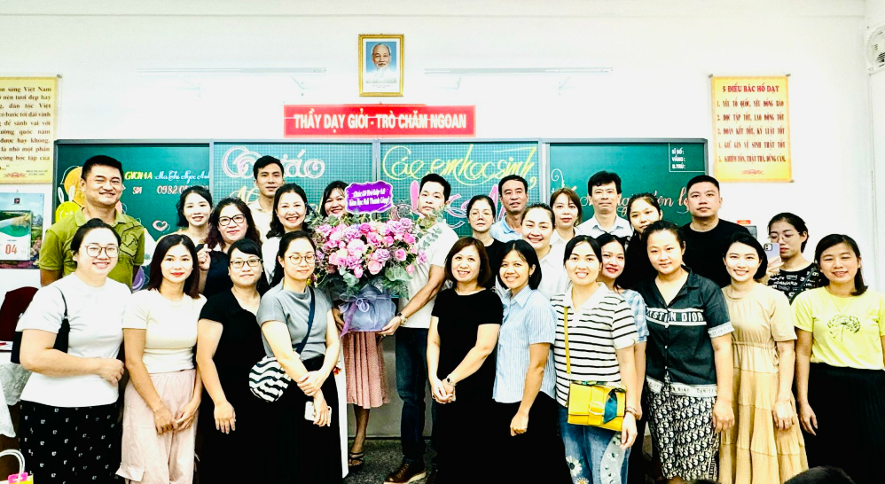 Phụ huynh lớp 1A dành những bó hoa tươi thắm để tỏ lòng biết ơn đối với cô Ngọc Anh.