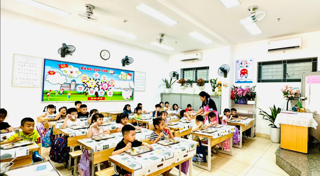 Sự hứng thú, tò mò không chỉ đến từ hoạt động tập thể ngoài sân trường. Hoạt động ăn trưa bán trú dù không liên quan việc học văn hóa, nhưng thực sự là một trải nghiệm thú vị mà trong đó, các con được hướng dẫn sinh hoạt chung, ấm cúng như một gia đình.