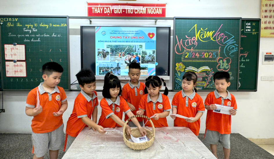 Các con lớp 1A tự tay quyên góp ủng hộ đồng bào bị thiệt hại do bão số 3 (Yagi).