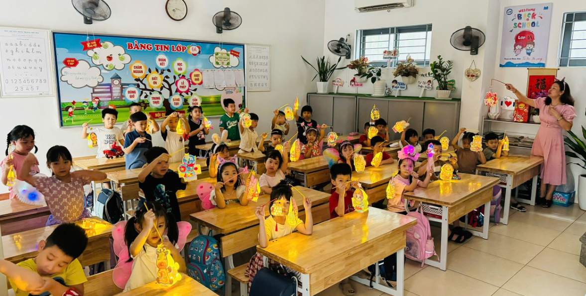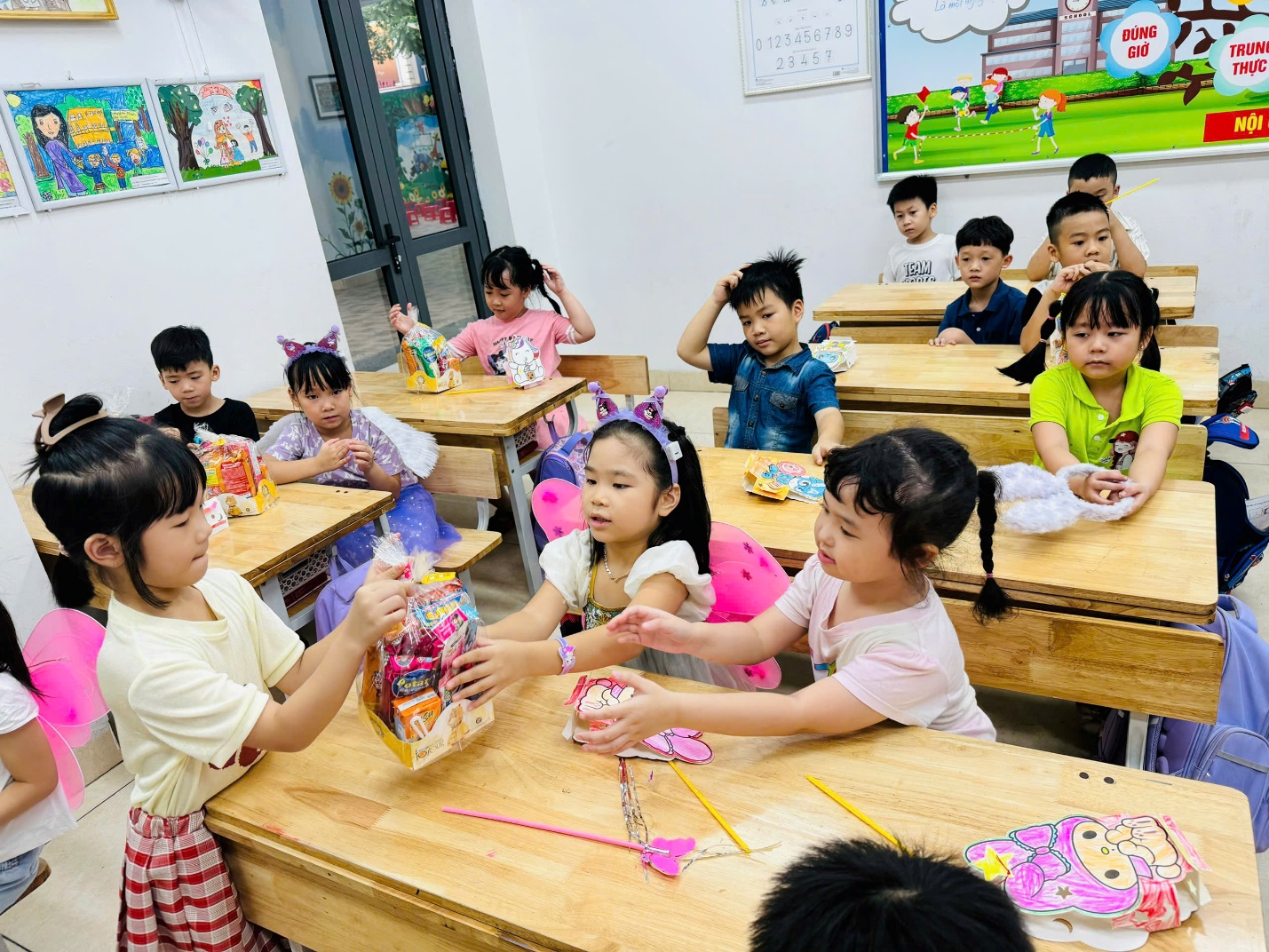 Để thể hiện sự quan tâm, đồng cảm với những nỗi đau, mất mát của người dân nhiều tỉnh, thành phía Bắc trong con bão số 3, các con lớp 1A đã được đón một cái Tết Trung thu dù đơn giản nhưng không thiếu sự ấm áp. Ngoài việc được tự tay làm và trang trí đèn lồng, các con còn được nhận những phần quà nhỏ xinh nhưng ý nghĩa.
