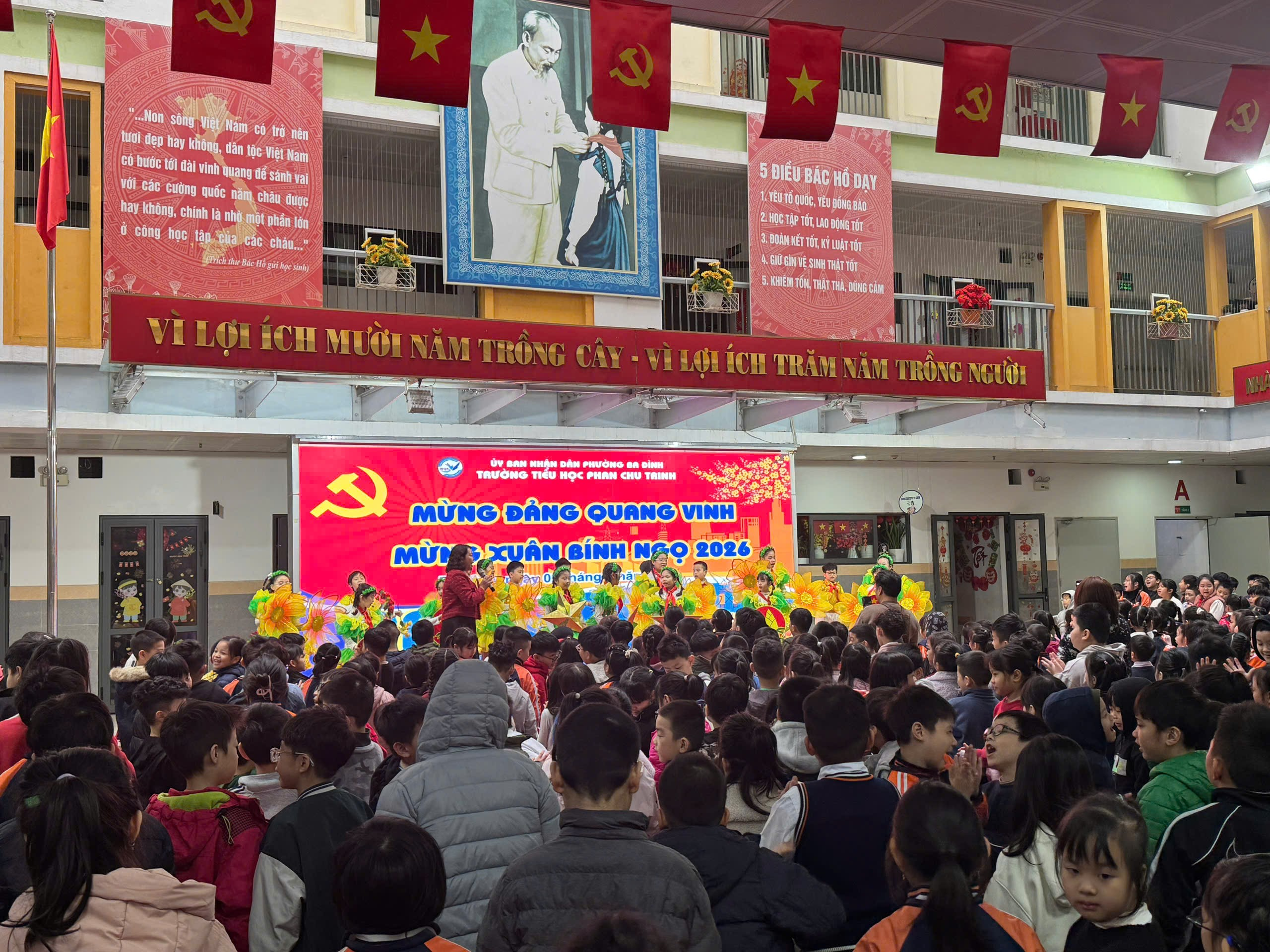 Sáng thứ Hai ngày 02/02/2026, trong tiết Hoạt động tập thể - Chào cờ đầu tuần, tập thể lớp 4E trường Tiểu học Phan Chu Trinh đã mang đến tiết mục văn nghệ đặc sắc Liên khúc “Em là mầm non của Đảng - Ca ngợi Tổ quốc”, góp phần tạo nên không khí trang nghiêm, xúc động, chào mừng 96 năm Ngày thành lập Đảng Cộng sản Việt Nam.