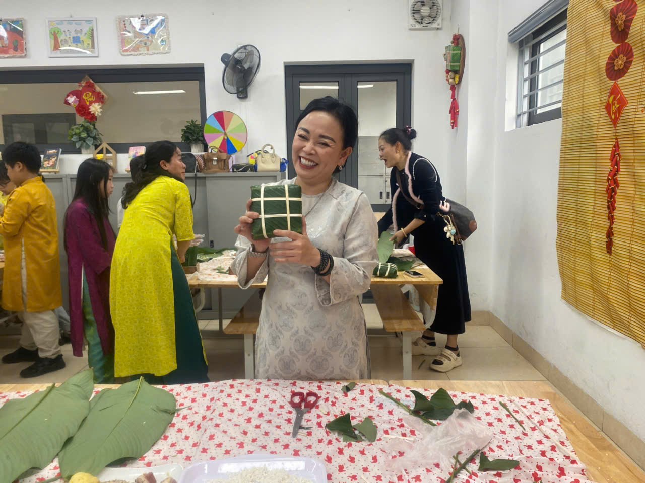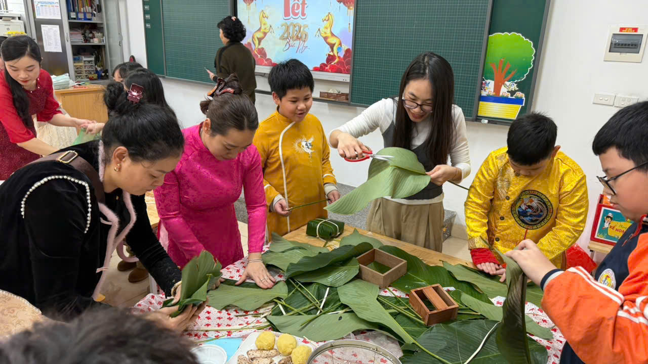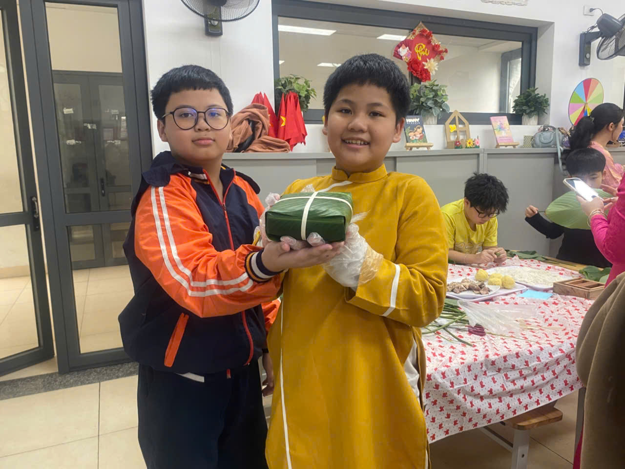 Những bàn tay lớn – nhỏ cùng rửa lá, gấp khuôn, chỉnh từng nếp bánh. Có em chăm chú quan sát rồi làm theo từng thao tác. Có mẹ nhẹ nhàng hỏi con cách buộc cho chắc, hai mẹ con cùng cúi xuống chỉnh lại chiếc bánh cho vuông vắn hơn. Không còn khoảng cách giữa nhà trường và gia đình, giữa người lớn và trẻ nhỏ. Tất cả cùng chung một niềm vui, cùng hướng về giá trị truyền thống của Tết cổ truyền. Không gian như một gian bếp ngày xuân thu nhỏ, ấm áp và đầy ắp tiếng cười.