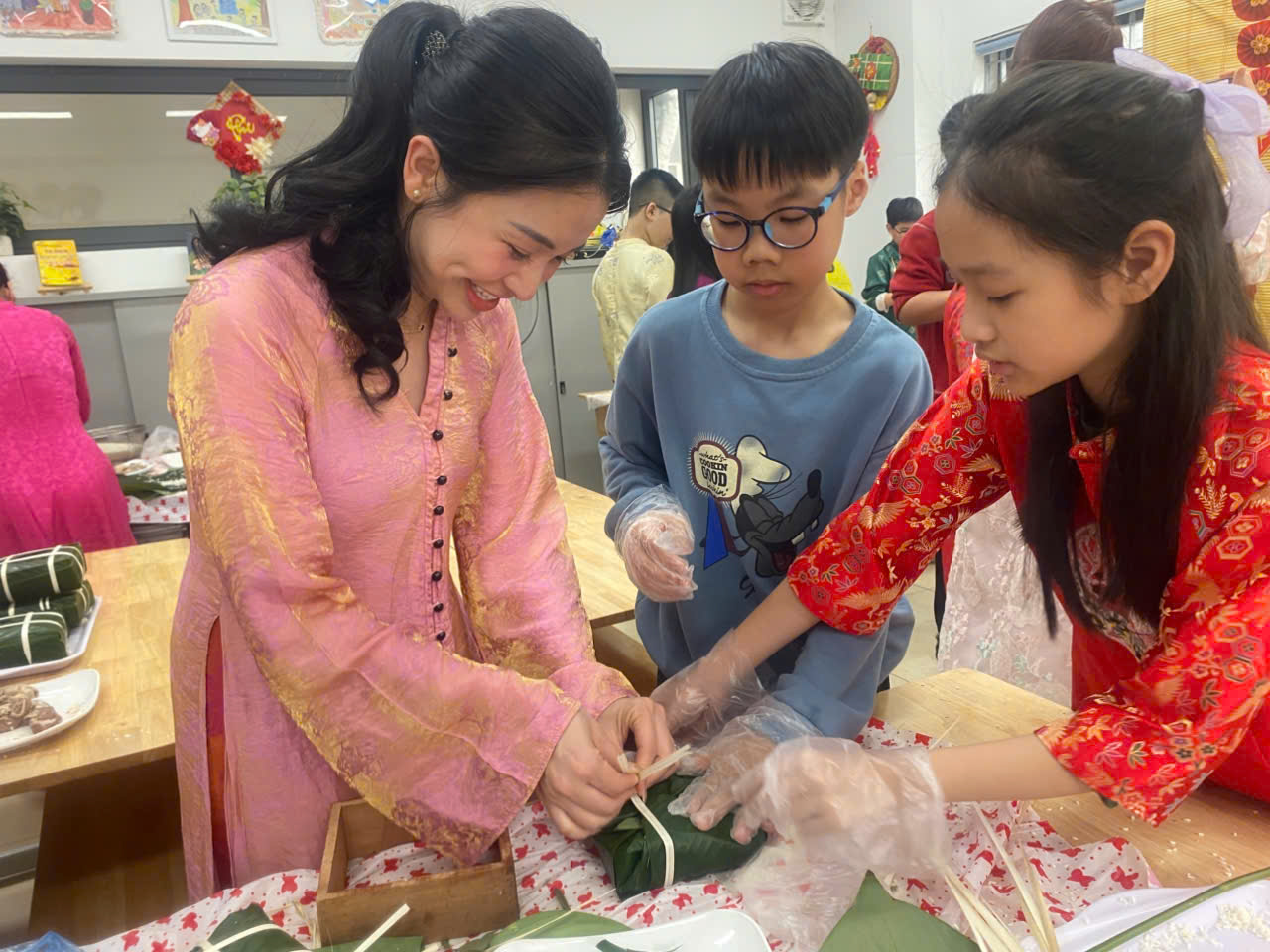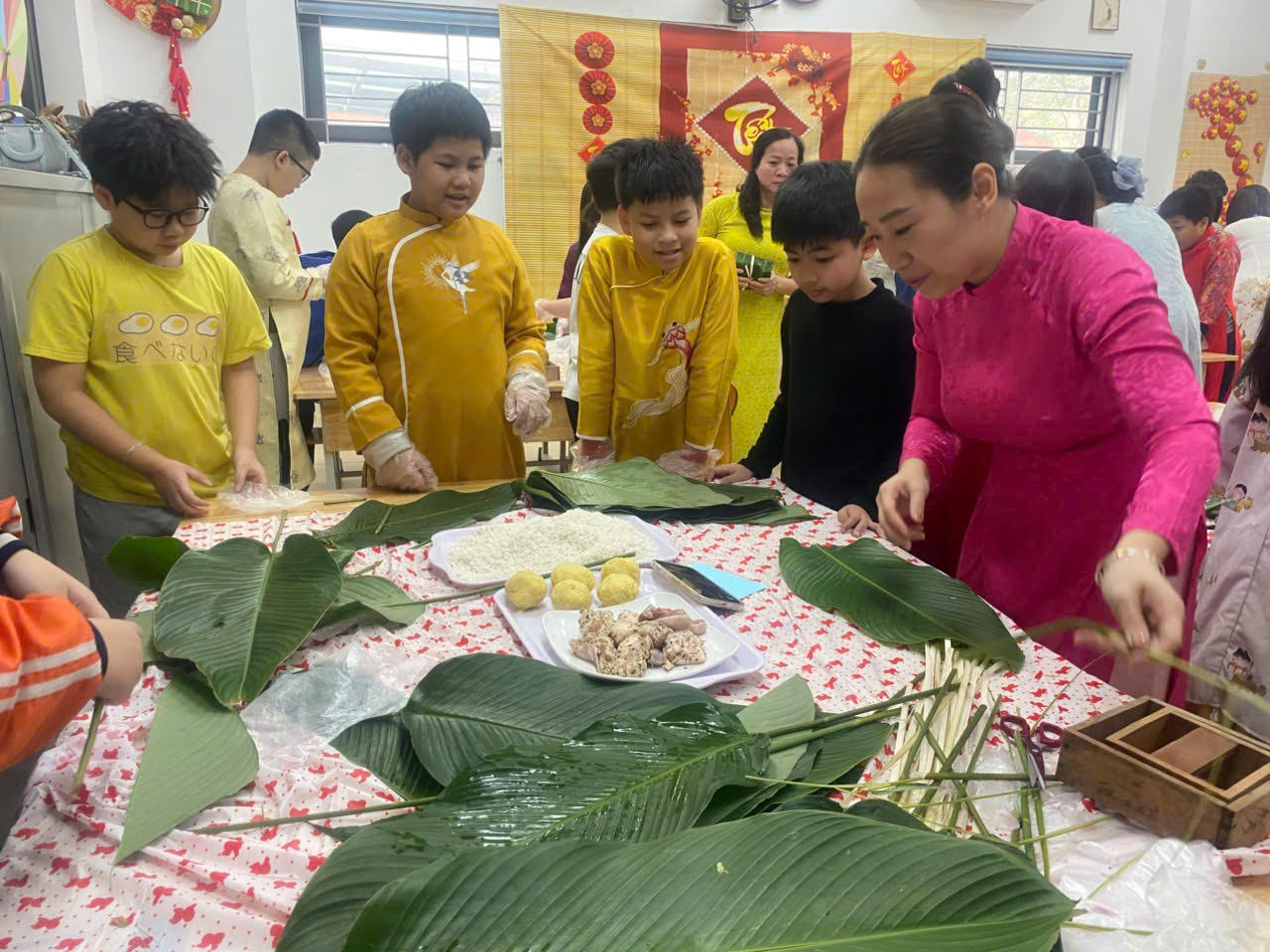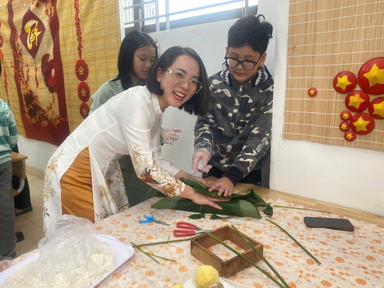 Những bàn tay lớn – nhỏ cùng rửa lá, gấp khuôn, chỉnh từng nếp bánh. Có em chăm chú quan sát rồi làm theo từng thao tác. Có mẹ nhẹ nhàng hỏi con cách buộc cho chắc, hai mẹ con cùng cúi xuống chỉnh lại chiếc bánh cho vuông vắn hơn. Không còn khoảng cách giữa nhà trường và gia đình, giữa người lớn và trẻ nhỏ. Tất cả cùng chung một niềm vui, cùng hướng về giá trị truyền thống của Tết cổ truyền. Không gian như một gian bếp ngày xuân thu nhỏ, ấm áp và đầy ắp tiếng cười.