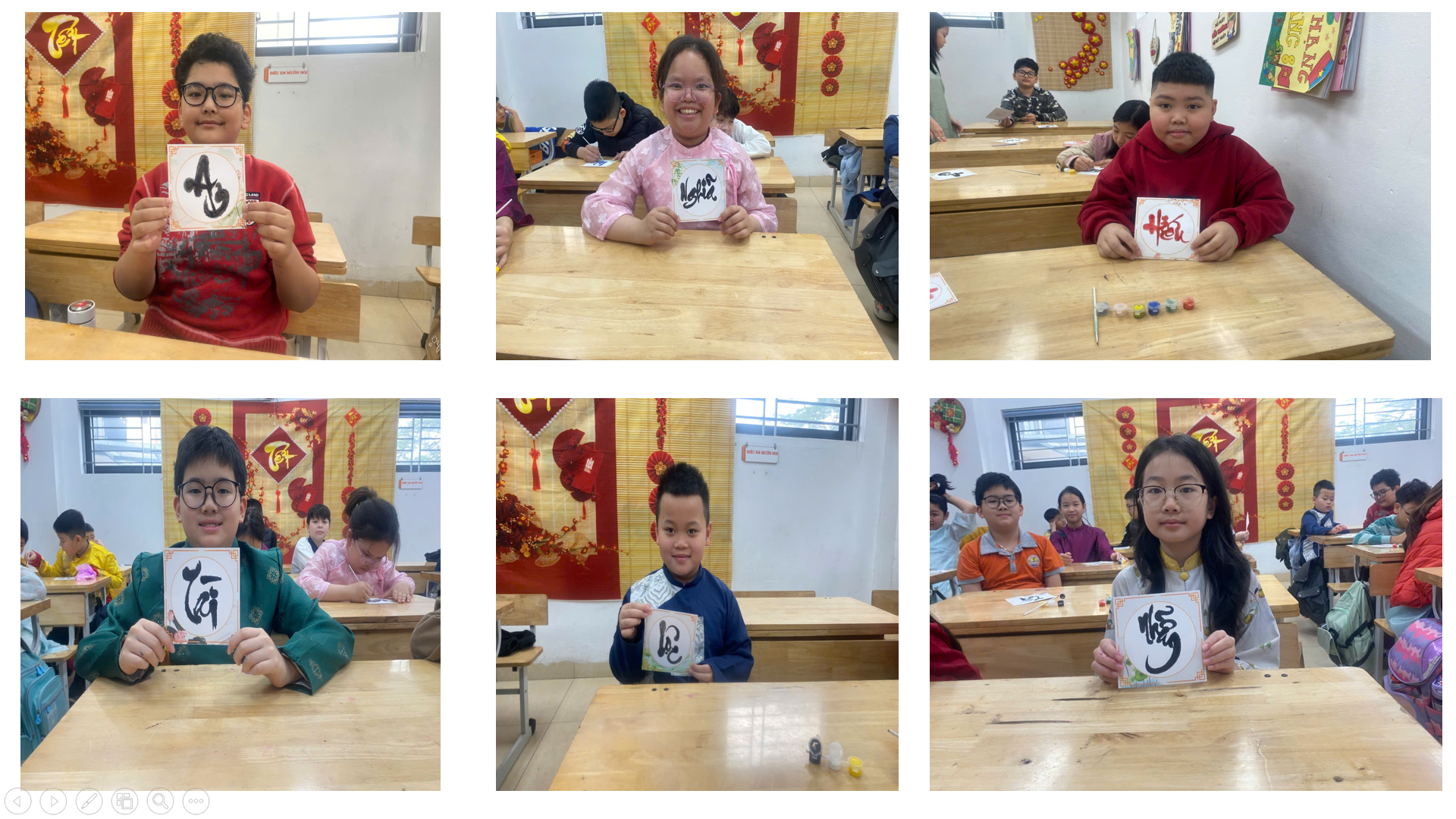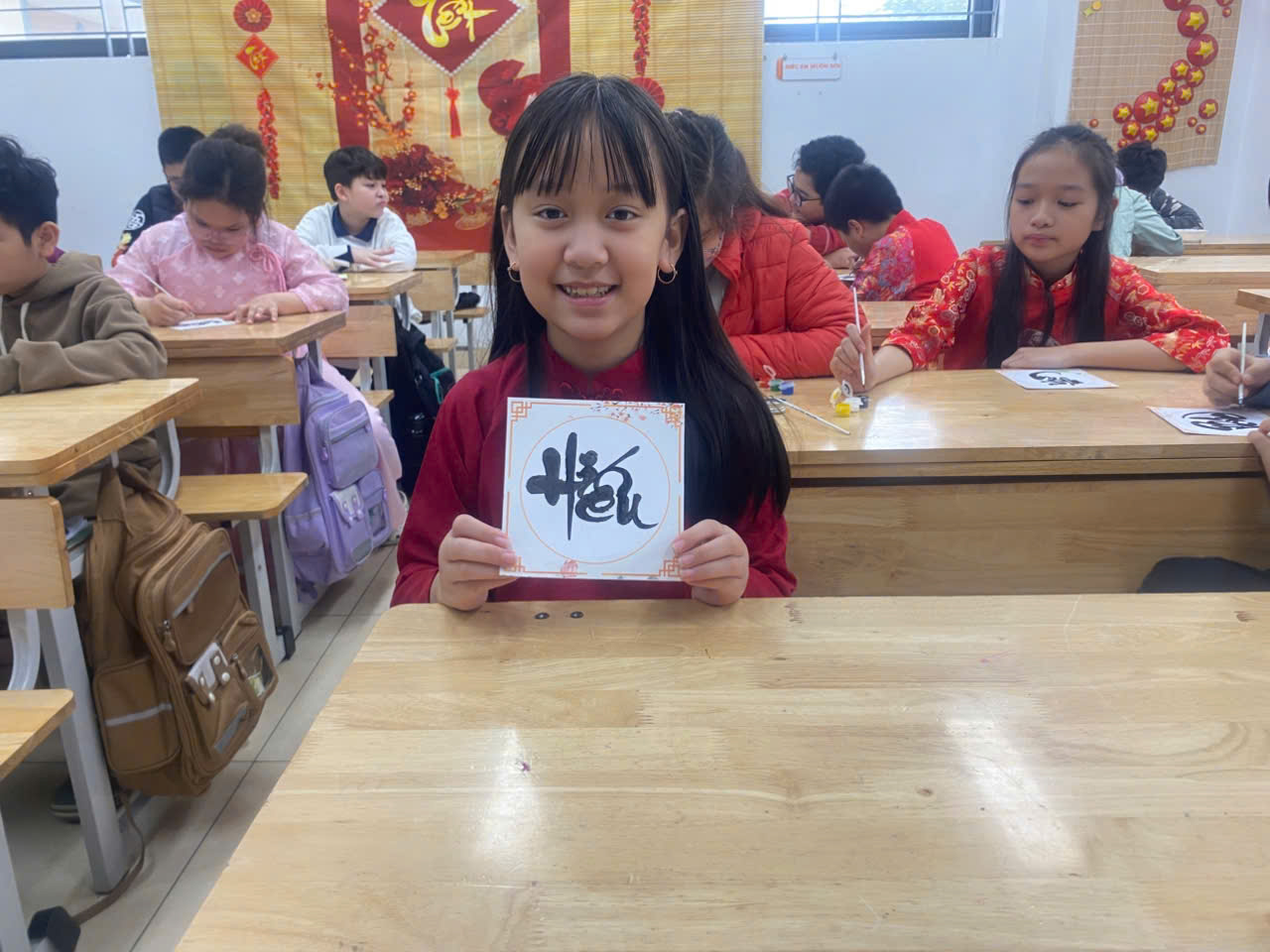 Mở đầu chương trình là phần giới thiệu về nghệ thuật thư pháp – tinh hoa văn hoá truyền thống của dân tộc. Trước những tờ giấy vuông vắn, học sinh chăm chú lắng nghe, cẩn thận tập viết từng nét chữ. Mỗi em lựa chọn cho mình một chữ mang theo ước nguyện đầu năm: An – mong bình yên, Lộc – mong may mắn, Hiếu – nhắc nhớ lòng biết ơn, Tâm, Nhẫn, Đức, Nghĩa… Những nét bút còn vụng về nhưng chứa đựng bao hy vọng trong trẻo. Không gian lớp học lắng lại trong sự tập trung, háo hức và niềm tự hào khi mỗi em hoàn thành “chữ xuân” của riêng mình.