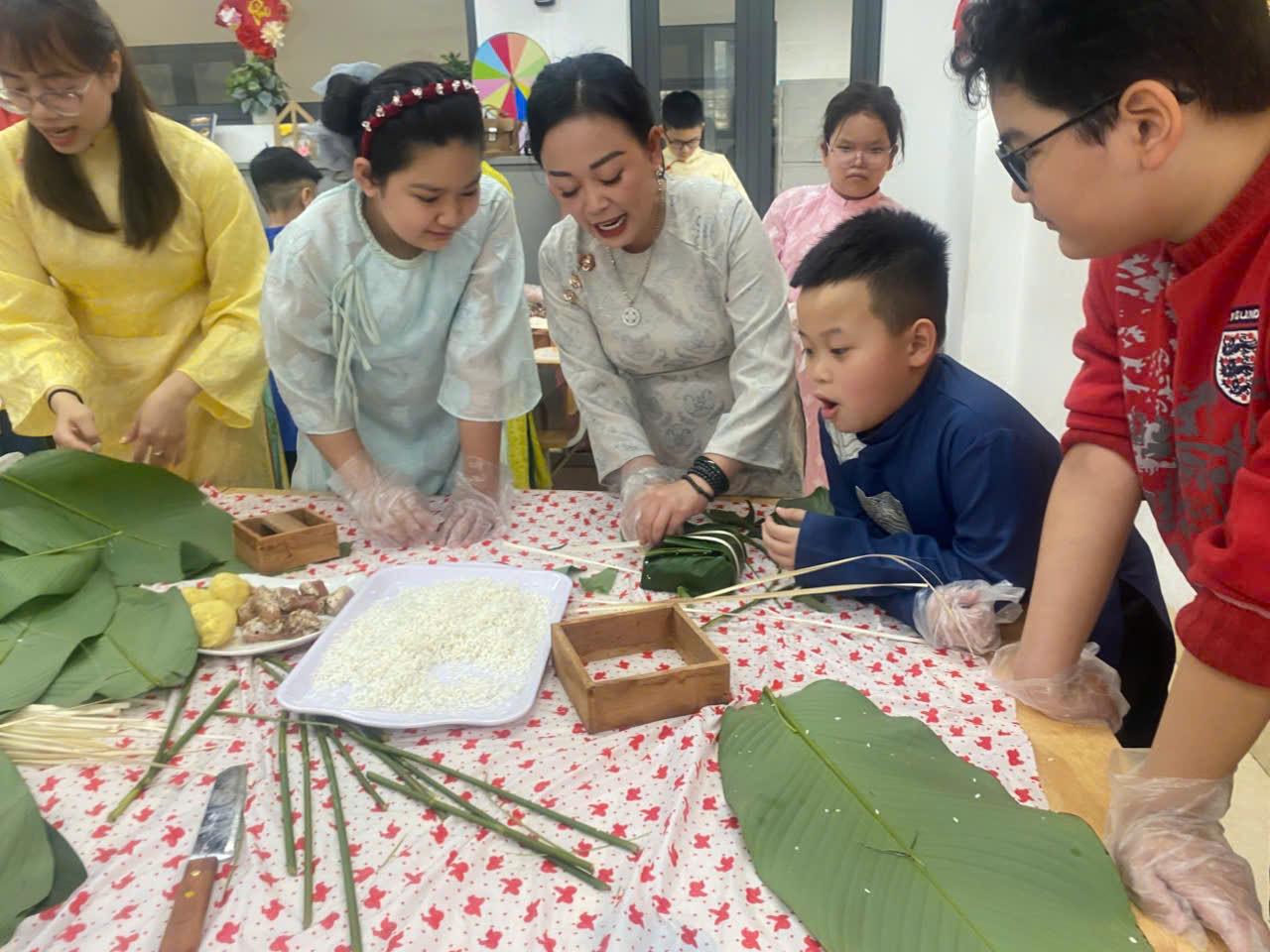 Không khí trở nên sôi nổi hơn với phần thi gói bánh chưng. Phụ huynh và học sinh được chia thành tám đội, cùng nhau chuẩn bị lá dong, gạo nếp, đỗ xanh, thịt lợn. Điều đặc biệt là nhiều mẹ cũng lần đầu tiên được tự tay gói bánh. Những phút đầu còn bỡ ngỡ khi xếp lá, đong gạo, buộc lạt, nhưng chính sự lúng túng ấy lại mang đến những tiếng cười vui, sự háo hức như được sống lại những ký ức tuổi thơ.