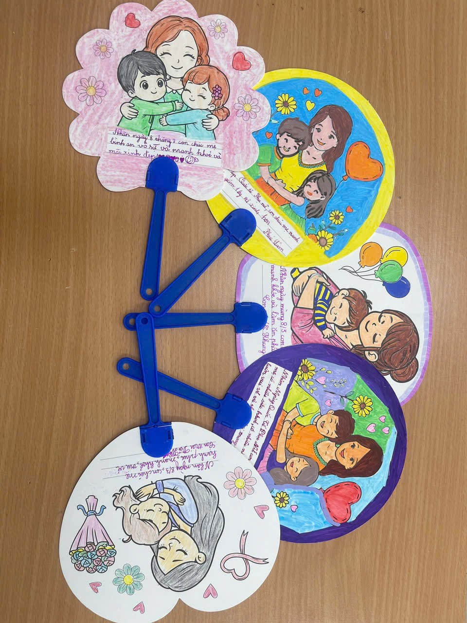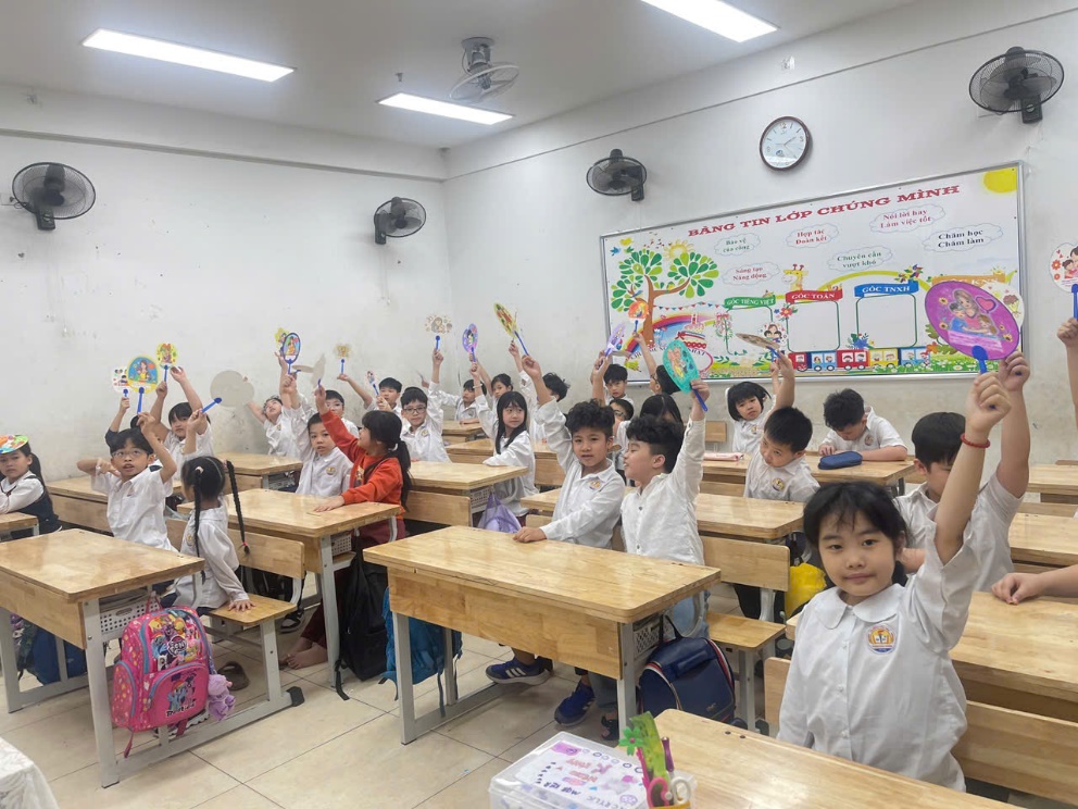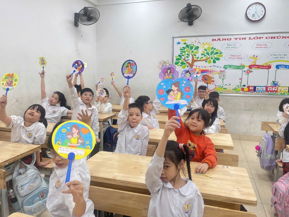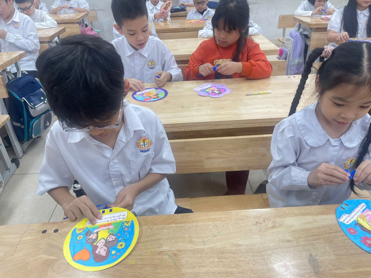Cuối cùng là hoạt động viết và trang trí thiệp chúc mừng bà, mẹ, cô giáo. Thay vì những tấm thiệp thông thường, các bạn đã tự tay trang trí và viết lời chúc lên những chiếc quạt giấy. Mỗi chiếc quạt là một tác phẩm nghệ thuật rực rỡ sắc màu, mang theo luồng gió mát lành của tình yêu thương và những lời chúc ngây ngô nhưng đầy chân thành gửi đến bà, đến mẹ yêu.