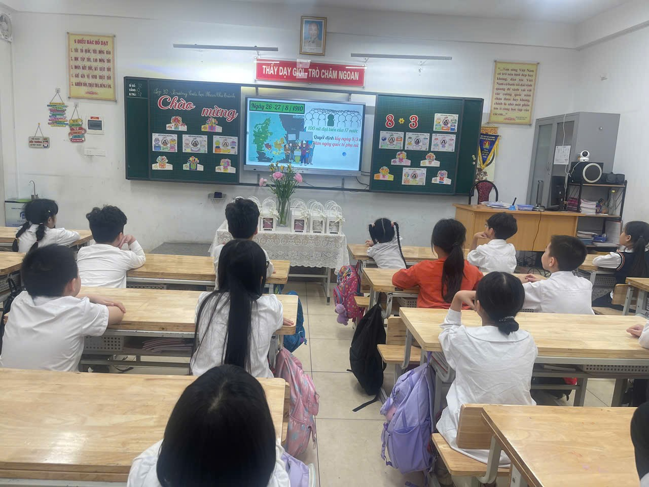 Sau đó, cô giáo cho các bạn xem một video ngắn về lịch sử ra đời của ngày Quốc tế Phụ nữ. Qua những thước phim tư liệu sinh động, các bạn đã hiểu hơn về nguồn gốc và ý nghĩa của ngày Quốc tế Phụ nữ. Biết ơn những người phụ nữ mạnh mẽ trong lịch sử chính là bài học về sự tôn trọng mà các bạn được tiếp nhận hôm nay.