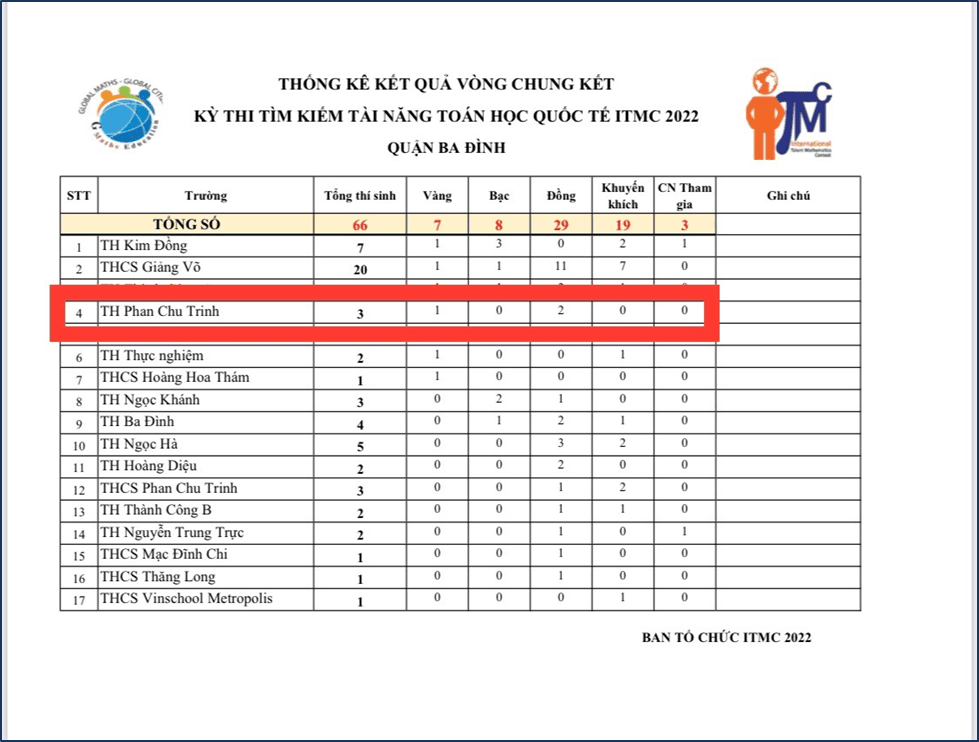 Ngày 20/02/2022, tại Kỳ thi Tìm kiếm tài năng Toán học Quốc tế ITMC 2022, trường TH Phan Chu Trinh có 3 học sinh xuất sắc lọt vào vòng Chung kết và đạt 1 giải Vàng, 2 giải Đồng.