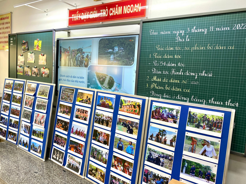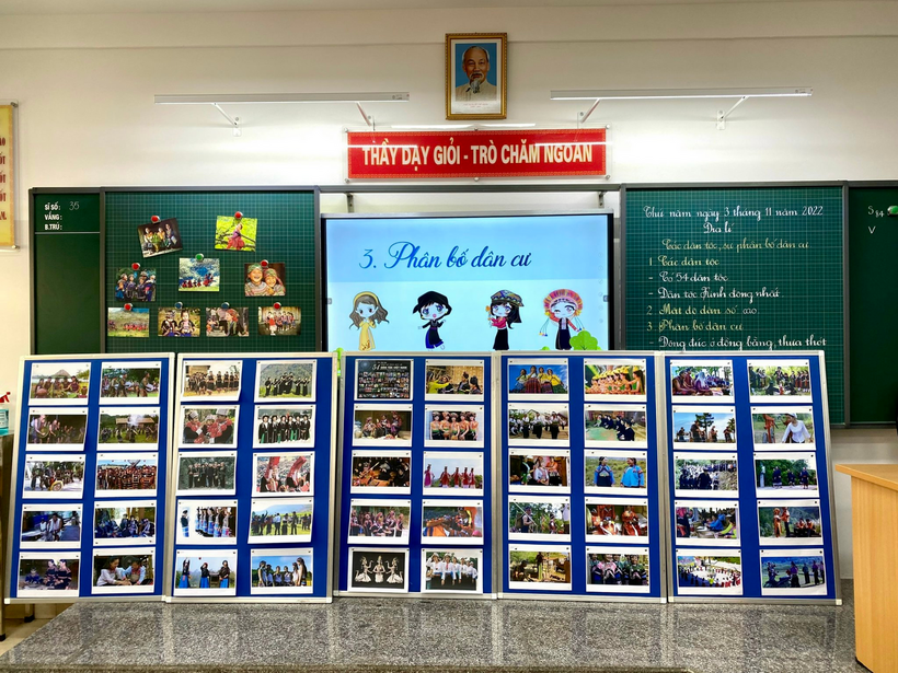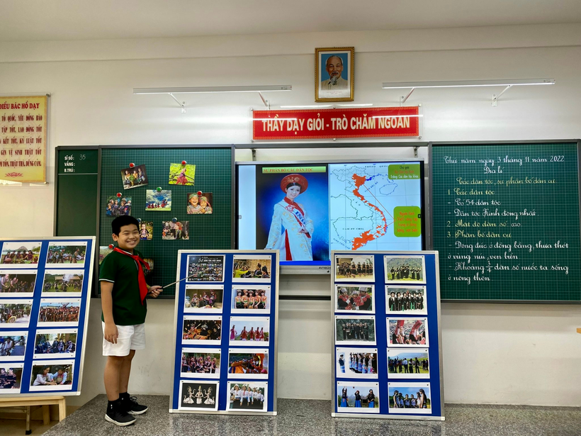 Tiết hội giảng Địa lí bài: “Các dân tộc và sự phân bố dân cư” của cô giáo Nguyễn Ngọc Anh – GVCN lớp 5B. Cô đã sử dụng nhiều phương pháp dạy học khác nhau. Kĩ năng sử dụng lược đồ, tổng hợp kiến thức qua sơ đồ tư duy được cô vận dụng hiểu quả. Thông qua hệ thống câu hỏi dẫn dắt tìm hiểu bài hợp lí, mạch lạc học sinh nắm vững được mối quan hệ giữa các yếu tố địa lí, thể hiện tốt kĩ năng chỉ bản đồ và hệ thống kiến thức về địa hình, sự phân bố dân cư….. Các trò chơi được cô đưa vào bài dạy nhẹ nhàng nhưng hiệu quả. Các nhóm hào hứng chia sẻ sự hiểu biết của mình về các dân tộc trên đất nước ta qua tranh ảnh, video.