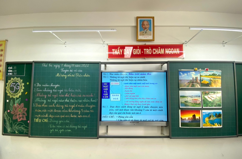 Tiết Luyện từ và câu bài: “Mở rộng vốn từ: Thiên nhiên” do cô giáo Hoàng Vân Anh - GVCN lớp 5G đảm nhiệm. Cô và trò khởi động vui vẻ để vào tiết học rất tự nhiên. Các hình thức dạy học trong tiết học được cô giáo tổ chức phong phú thay đổi theo từng nội dung bài tập. Cô giáo đã đưa ra nhiều hình thức giải nghĩa từ đa dạng như giải nghĩa qua tranh ảnh, bằng các đoạn video ngắn, hay những câu hỏi lựa chọn đáp án, câu hỏi xuôi, hỏi ngược, tìm từ đồng nghĩa, trái nghĩa giúp… các con có thể hiểu nghĩa từ một cách dễ dàng, tự nhiên và bài học không bị khô cứng.