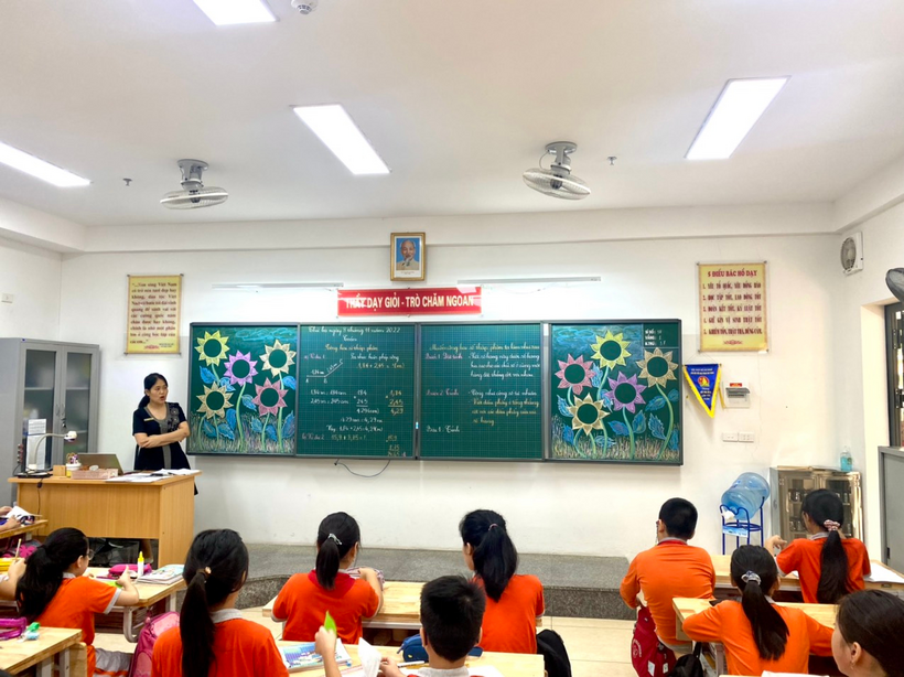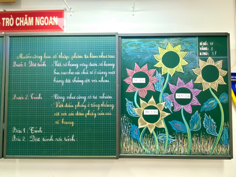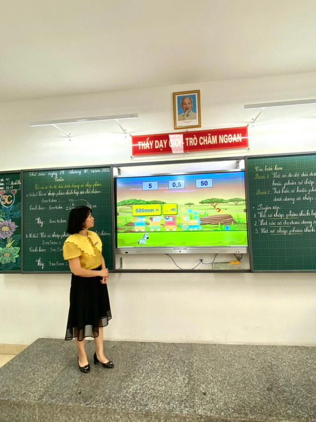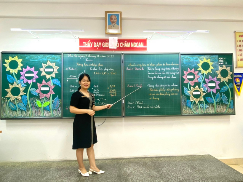 Kết thúc đợt hội giảng là tiết Toán: “Cộng hai số thập phân” đã được cô giáo Ngô Minh Châu - GVCN lớp 5A thiết kế đầy sáng tạo. Các con tự tin tìm hiểu, khám phá kiến thức dưới sự dẫn dắt dịu dàng của cô giáo. Các bước cộng hai số thập phân được cô giáo chốt kiến thức rõ ràng, mạch lạc giúp học sinh dễ hiểu và ghi nhớ kiến thức ngay trên lớp. Lớp học không còn khoảng cách khi cô trò sôi nổi hào hứng chơi trò chơi “ Hái hoa hướng dương”. Kết thúc tiết học, các bạn nhỏ còn lưu luyến mãi và mong được thực hiện nhiều phép tính hơn thế nữa.