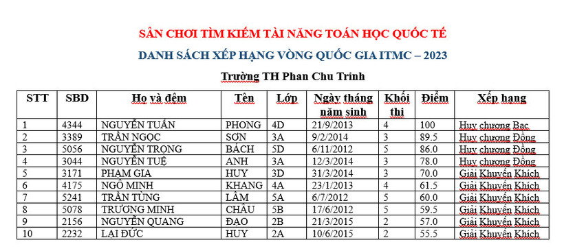 Kết quả sân chơi tìm kiếm tài năng toán học Quốc tế vòng Quốc gia - ITMC 2023 của học sinh Trường TH Phan Chu Trinh