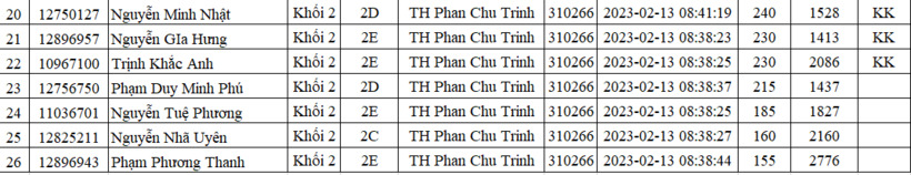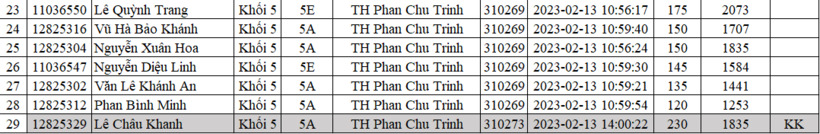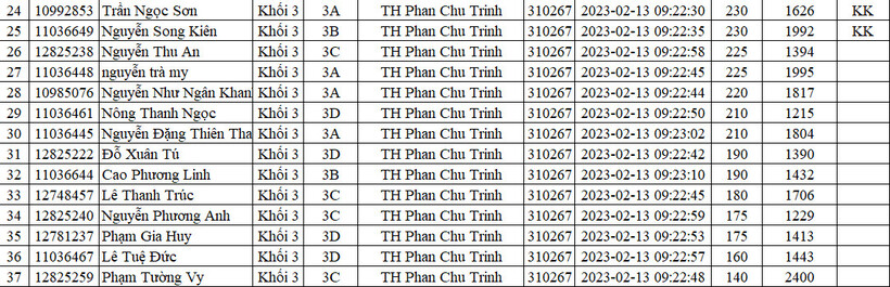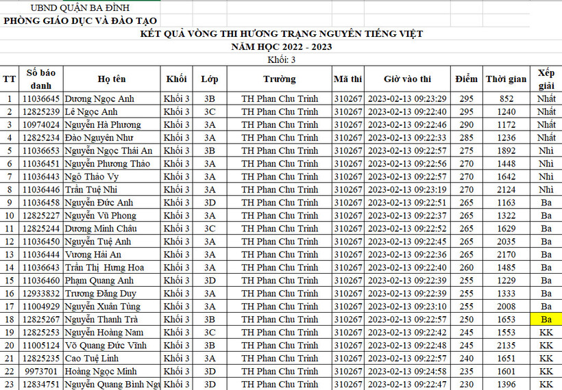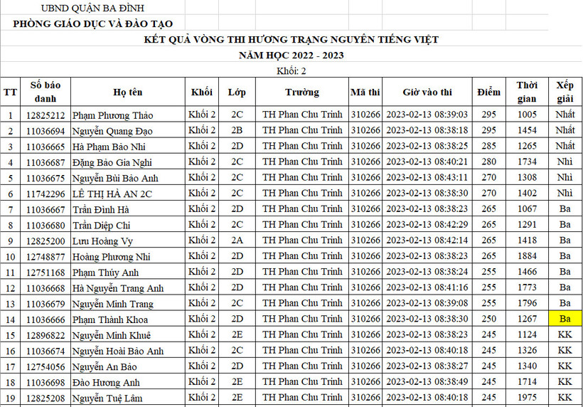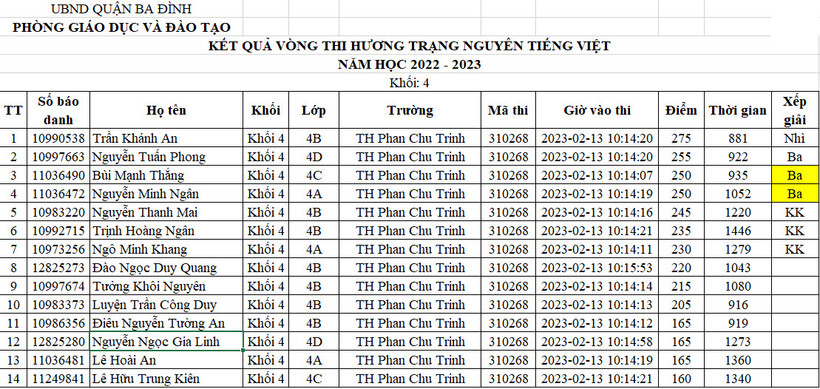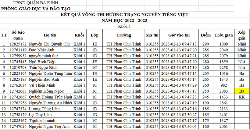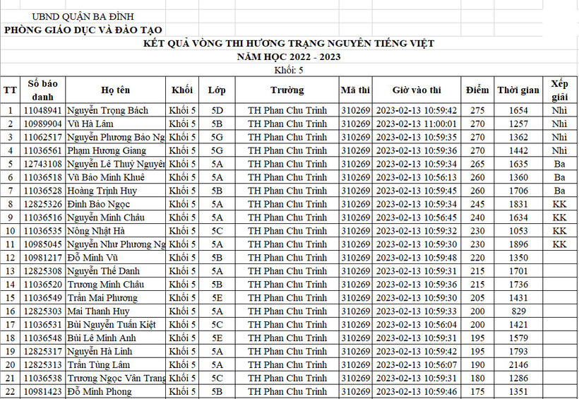 Kết quả thi Trạng nguyên Tiếng Việt cấp Quận năm học 2022 - 2023 của Trường Tiểu học Phan Chu Trinh