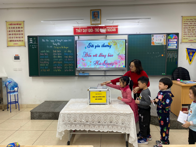 Thầy cô và các con học sinh toàn trường lên trao gửi yêu thương tới đồng bào Hà Giang với mong muốn góp những món nhỏ của mình để sẽ giúp các bạn có những cây cầu mới, với những phòng học khang trang hơn và những món quà dành tặng các bạn nhân dịp Tết đến, xuân về.