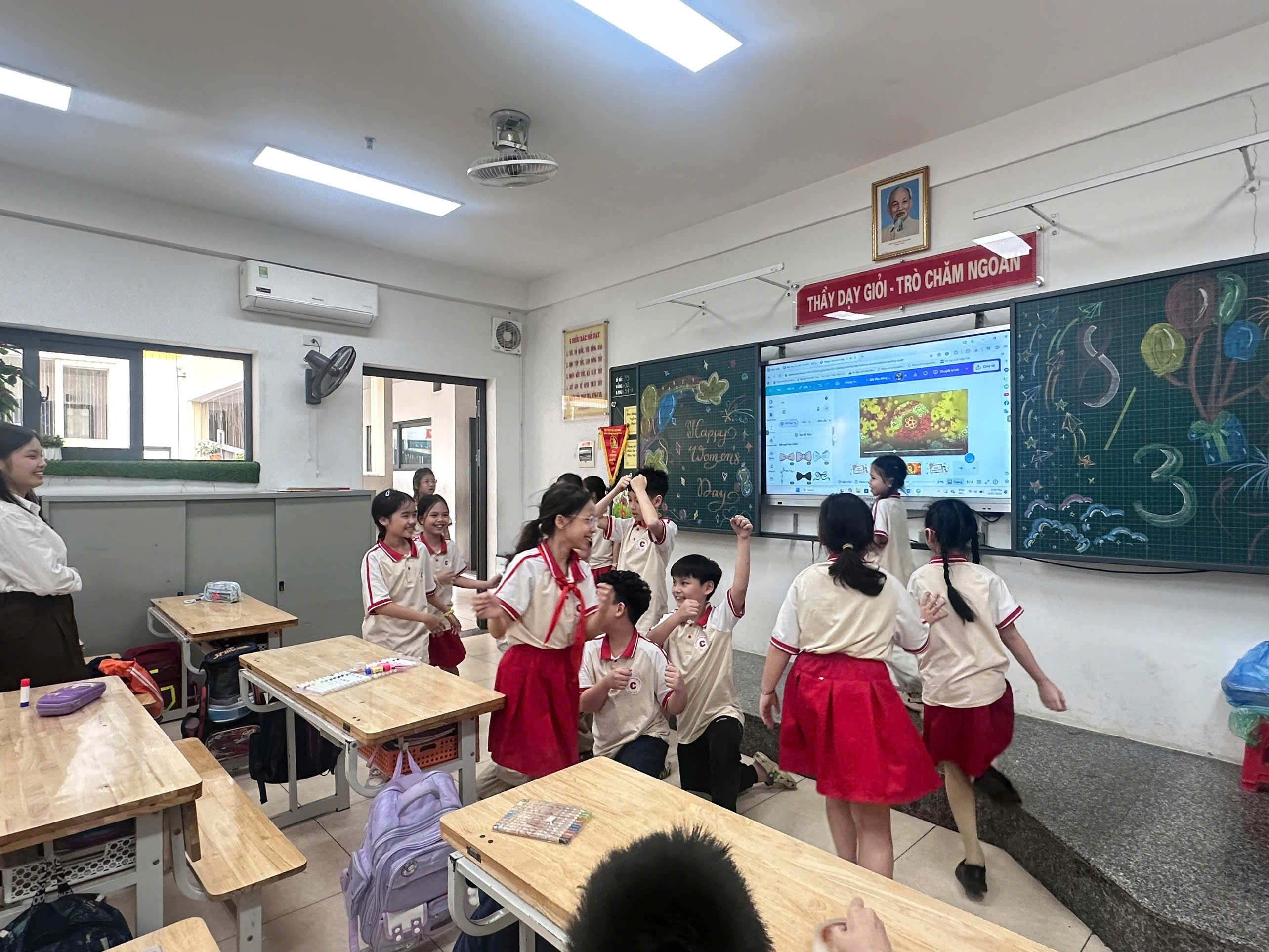 Đặc biệt, chương trình có sự đồng hành nhiệt tình của các cô giáo thực tập sinh – những người đã mang đến nhiều ý tưởng sáng tạo, tổ chức các hoạt động nhảy múa, trò chơi sôi động, góp phần tạo nên bầu không khí vui tươi, gắn kết trong lớp học. Dưới sự hướng dẫn tận tình của các cô, các em học sinh không chỉ được vui chơi mà còn hiểu sâu sắc hơn về ý nghĩa của Ngày Quốc tế Phụ nữ 8/3 – ngày tôn vinh những đóng góp to lớn của phụ nữ trong gia đình và xã hội.