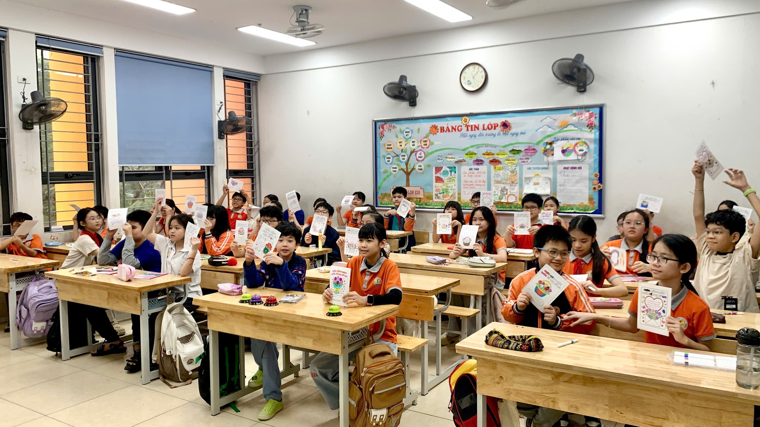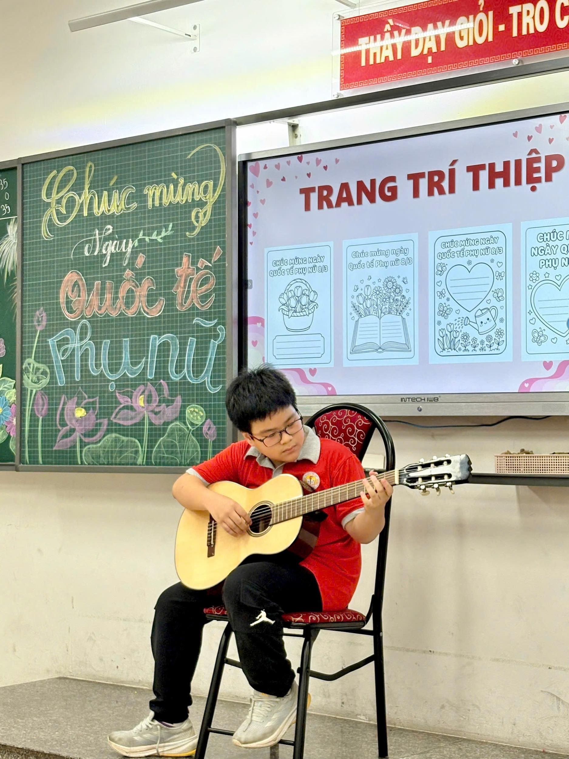 Một trong những hoạt động ý nghĩa nhất của chương trình là viết và trang trí thiệp tặng những người phụ nữ thân yêu. Mỗi bạn học sinh được phát một tấm thiệp nhỏ để tô màu và viết lời chúc dành cho mẹ, bà hoặc cô giáo. Những tấm thiệp tuy giản dị nhưng chứa đựng tình cảm chân thành và sự biết ơn của các em đối với những người phụ nữ quan trọng trong cuộc sống. Trong lúc làm thiệp cả lớp cùng được thưởng thức lắng nghe tiếng đàn.