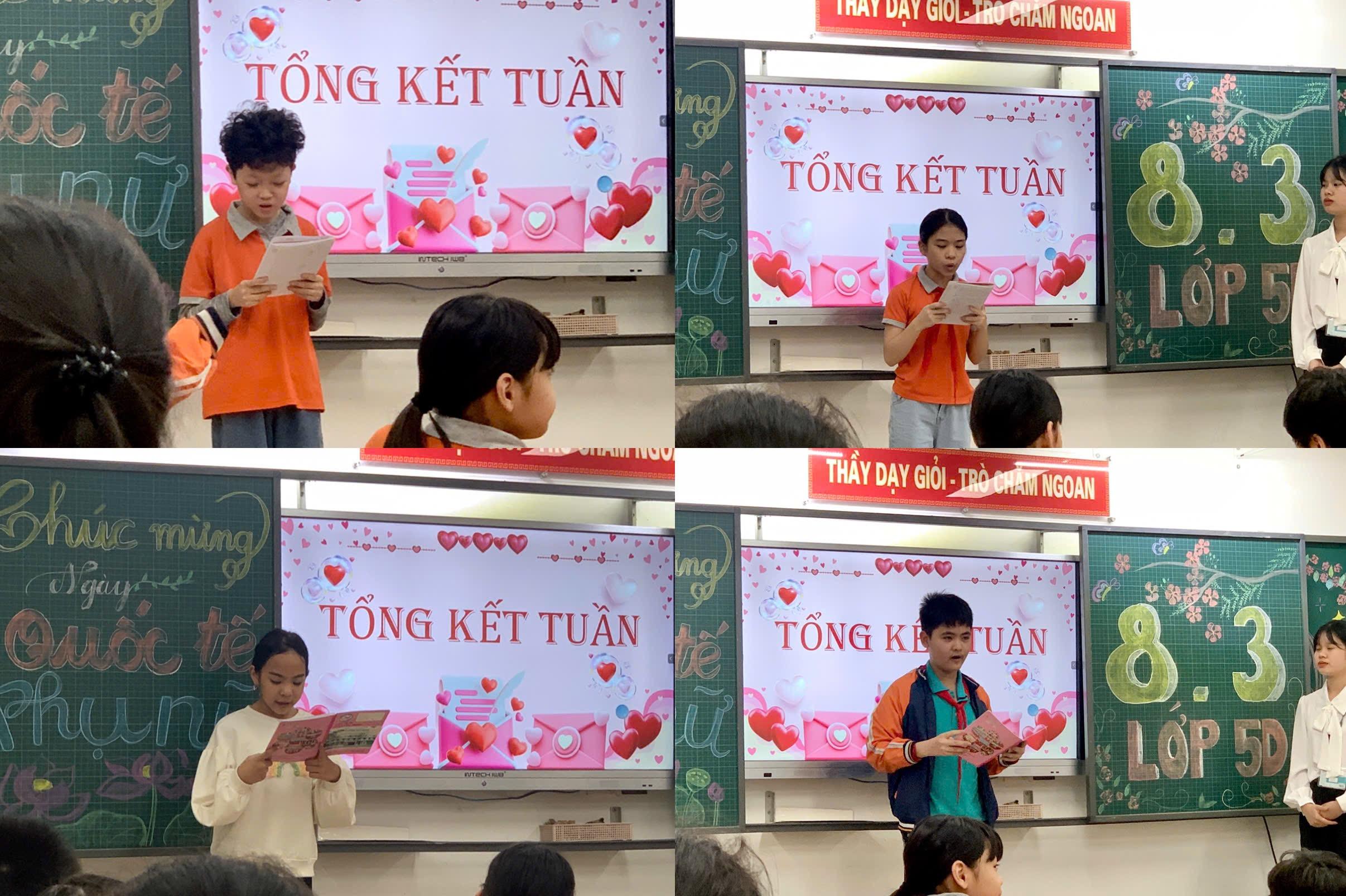 Mở đầu buổi sinh hoạt là phần tổng kết hoạt động trong tuần. Cán bộ lớp đã báo cáo tình hình học tập, nền nếp của các tổ trong tuần và tổng kết hoạt động thi đua chào mừng ngày Quốc tế Phụ nữ 8/3. Sau đó, cô giáo chủ nhiệm nhận xét, biểu dương những bạn có thành tích tốt và nhắc nhở một số nội dung cần cố gắng hơn trong tuần tới.