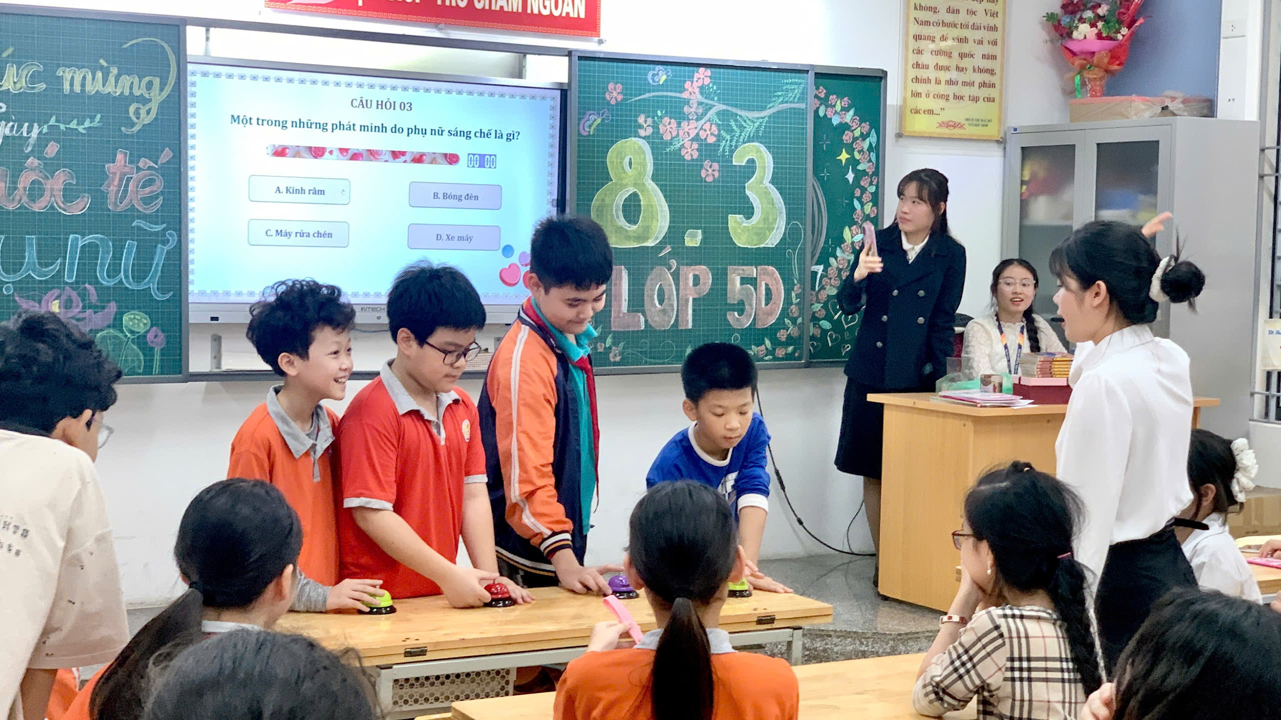 Không khí lớp học trở nên sôi động hơn với trò chơi “Thư tay yêu thương”. Mỗi tổ cử đại diện tham gia bấm chuông để giành quyền trả lời các câu hỏi trắc nghiệm liên quan đến ngày 8/3. Các câu hỏi được đặt trong những “hộp thư” nhỏ đầy thú vị, mang lại nhiều tiếng cười và sự hào hứng cho cả lớp. Hoạt động không chỉ giúp các em rèn luyện phản xạ nhanh mà còn tăng tinh thần đoàn kết giữa các bạn học sinh.