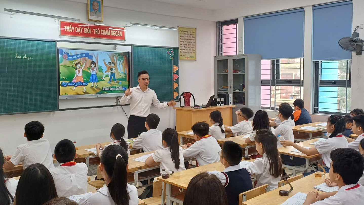 Tiết học với nội dung: Ôn tập bài hát “Tình bạn tuổi thơ”- giới thiệu nhạc sĩ Lưu Hữu Phước và bài hát “Reo vang bình minh”. Tiết học được thiết kế theo định hướng đổi mới phương pháp dạy học, lấy học sinh làm trung tâm, khuyến khích các em tham gia tích cực vào các hoạt động học tập.
