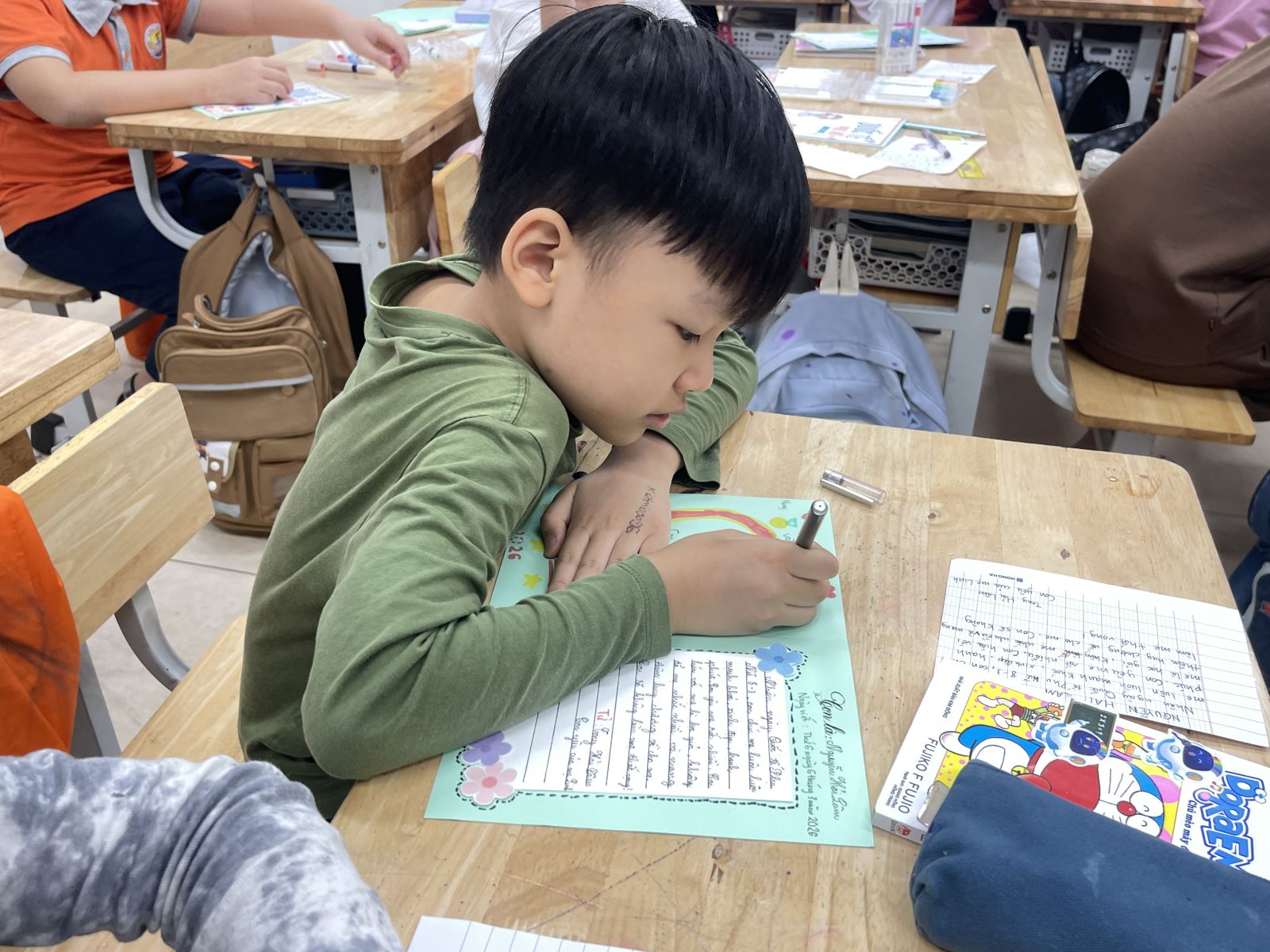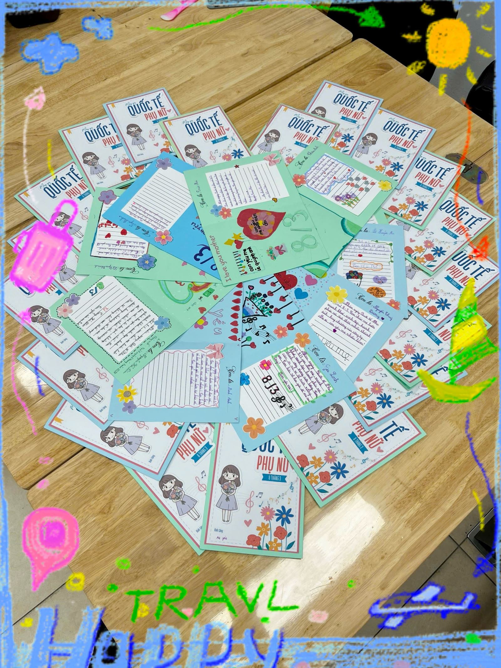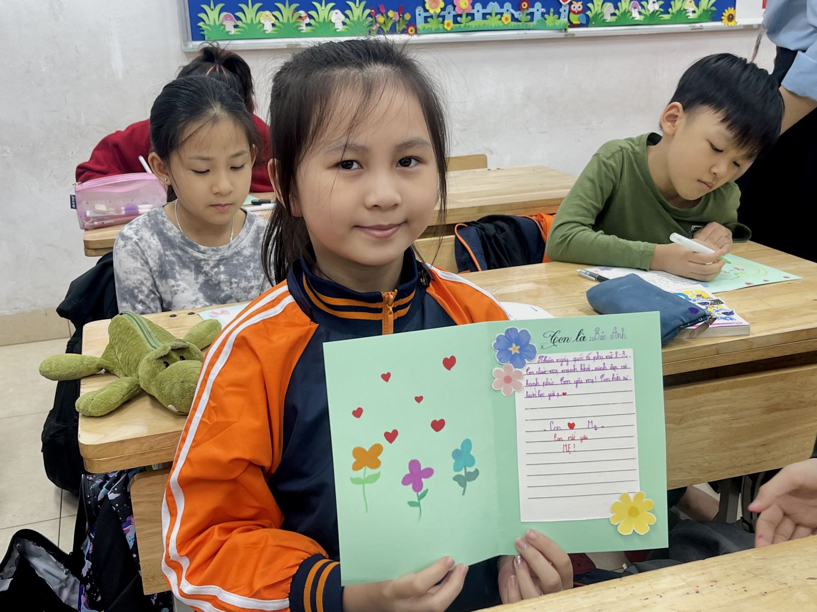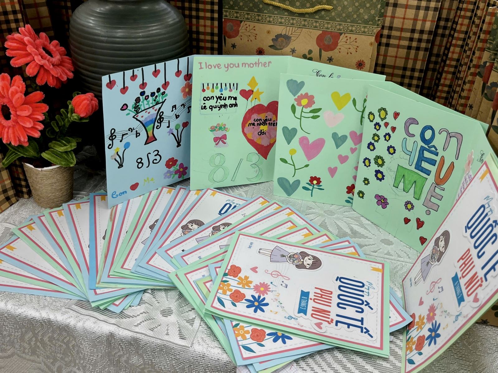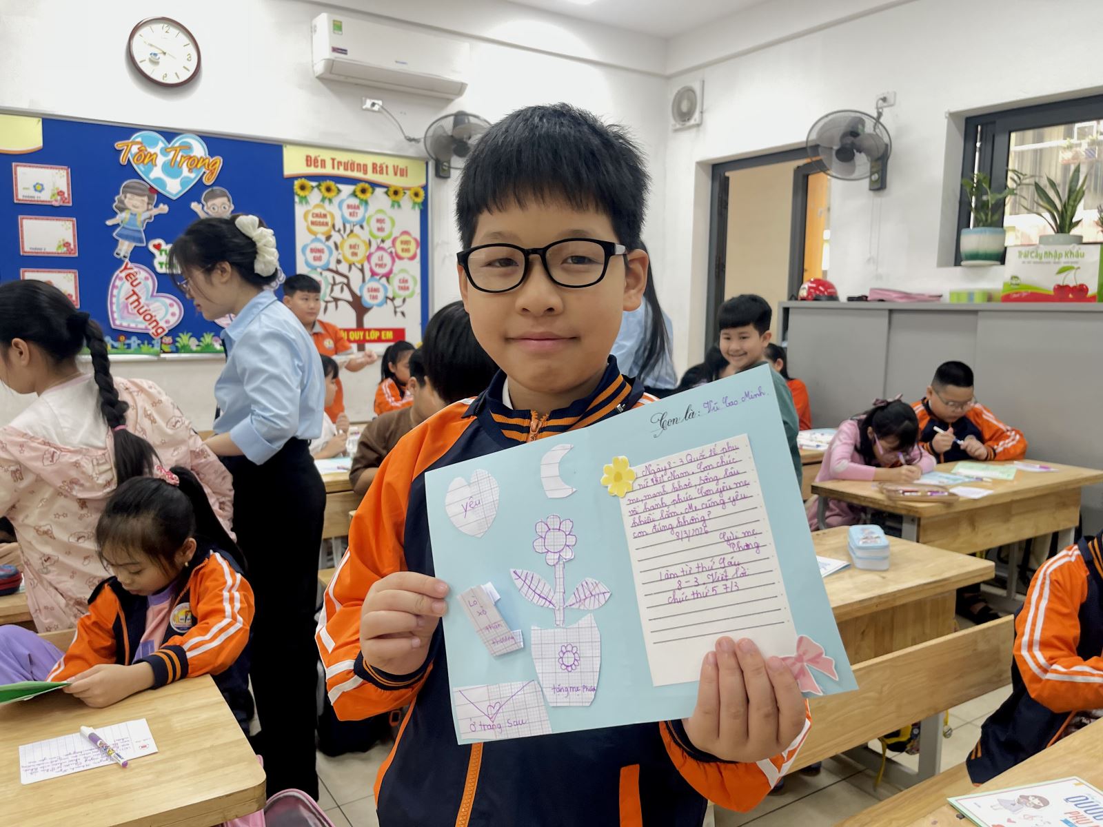Không chỉ chăm chút cho phần trang trí, các em còn nắn nót viết những lời chúc giản dị nhưng chan chứa yêu thương như: “Con chúc mẹ luôn mạnh khỏe”, “Con cảm ơn mẹ vì đã chăm sóc con”, “Con yêu mẹ rất nhiều”. Dù còn đôi chút ngây ngô, những dòng chữ ấy lại chứa đựng tình cảm chân thành và trong trẻo của các em dành cho mẹ.