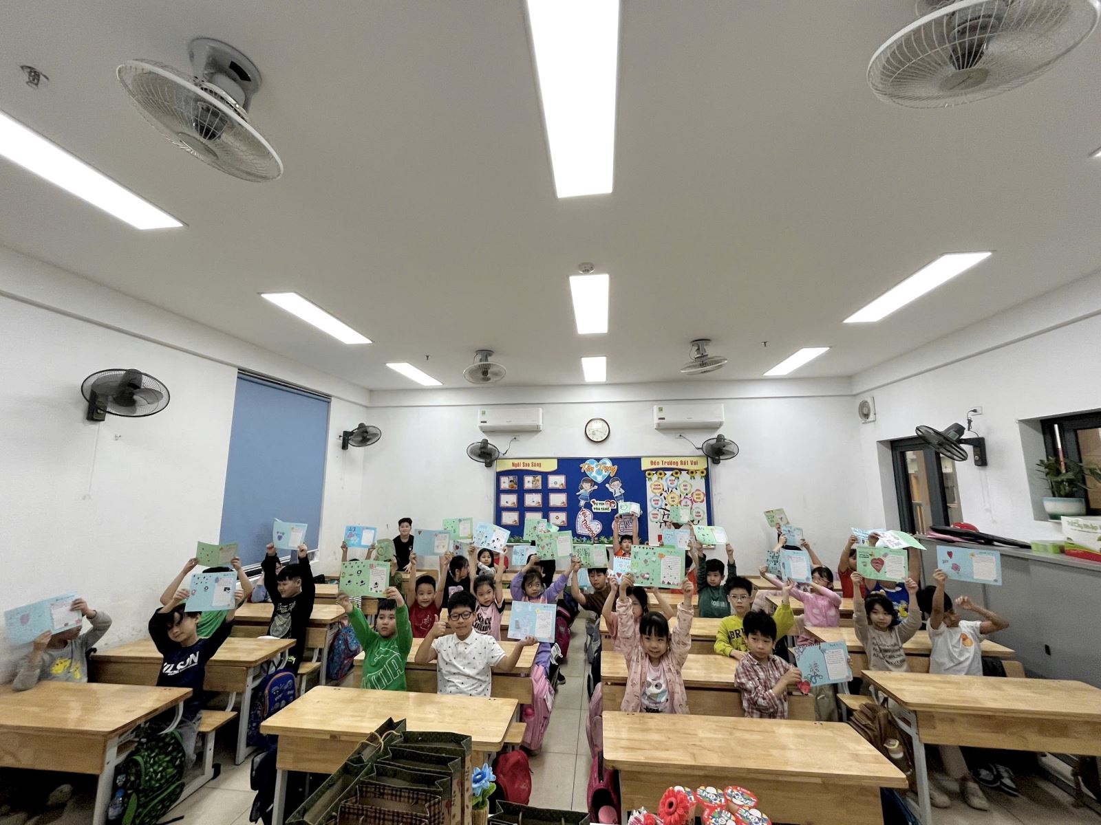 Trong giờ hoạt động, các bạn học sinh tham gia rất tích cực và đầy hứng khởi. Dưới sự hướng dẫn của giáo viên, các em tự tay cắt giấy, gấp thiệp và trang trí bằng nhiều màu sắc sinh động. Những bông hoa, trái tim, ngôi sao hay các họa tiết ngộ nghĩnh được thể hiện một cách khéo léo và sáng tạo trên từng tấm thiệp.