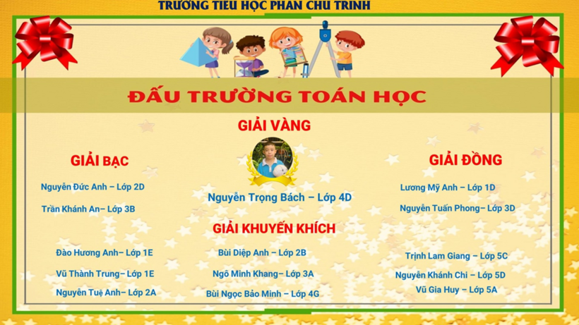 E:\anh vinh danh hs\FILE Bảng vinh danh hs 21.22 OK\bảng tổng hợp giải 21-22.jpgVới sự tâm huyết, dìu dắt các thầy cô giáo nhà trường, một năm học bội thu với 168 giải Quốc tế, Quốc gia, Thành phố và Quận đến từ những gương mặt Tiêu biểu của trò nhỏ Phan Chu Trinh đã được xướng danh trong các sân chơi của Ngành giáo dục. Những trái ngọt ngày hôm nay đã nối truyền tô thắm thêm thành tích truyền thống vẻ vang 75 năm của nhà trường. Sau đây chúng ta cùng nhìn ngắm lại những thành tích đáng tự hào và hành trang của các trò nhỏ trường TH Phan Chu Trinh trong năm học 2021 -2022 vừa qua.