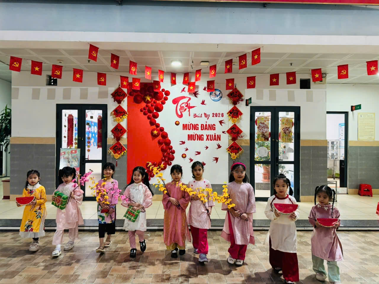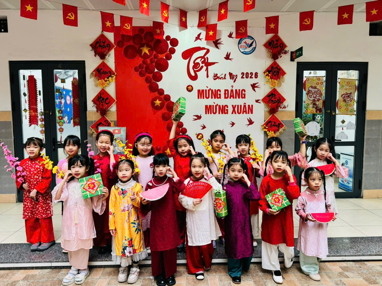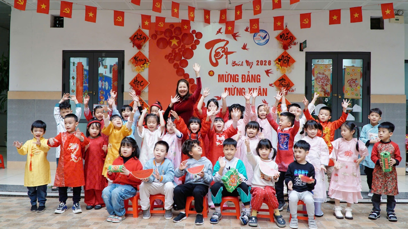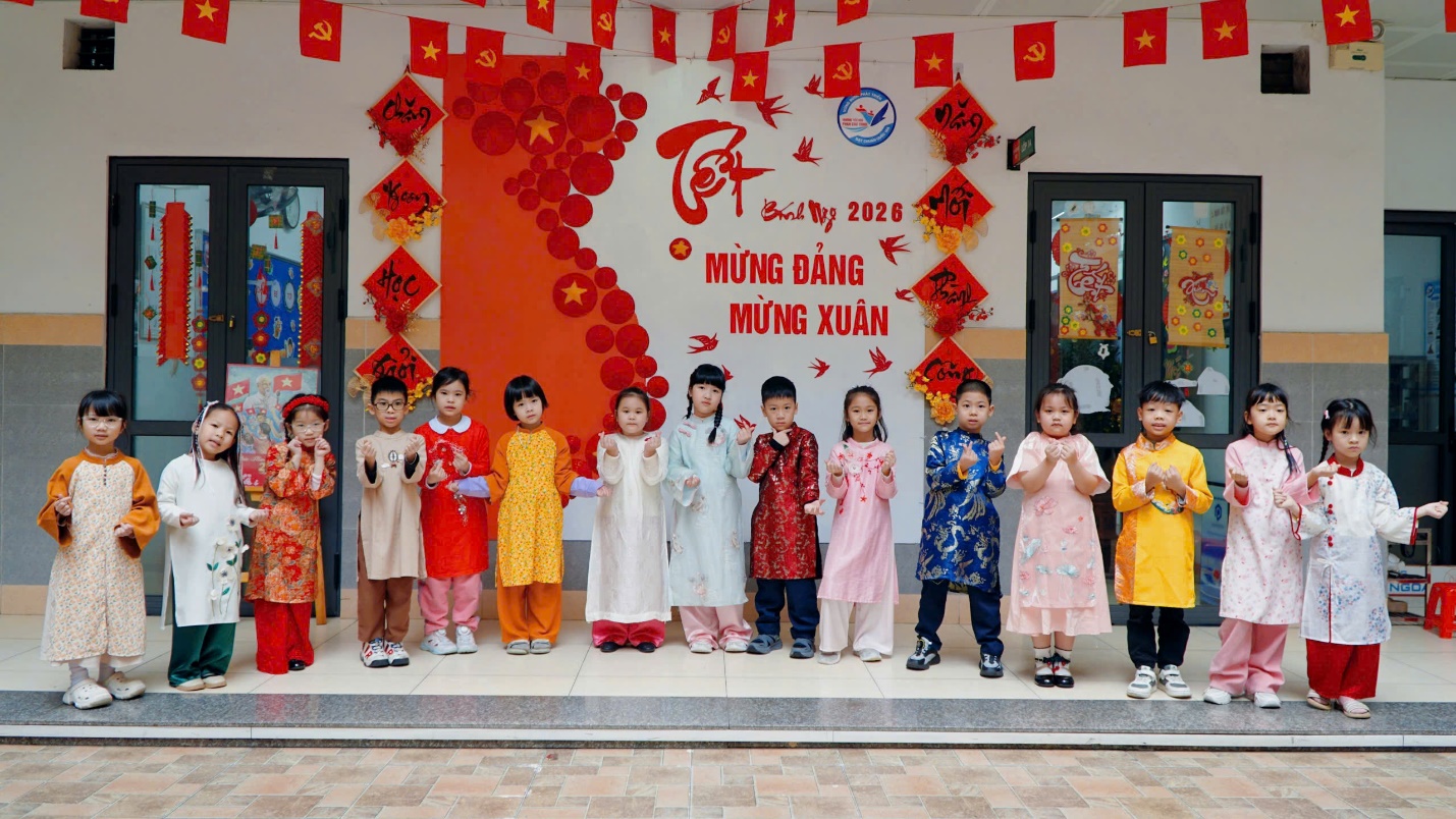 Không gian nhà trường được trang hoàng rực rỡ với cờ Tổ quốc, cờ Đảng, câu đối đỏ, hoa xuân và khu vực trang trí chủ đề “Mừng Đảng – Mừng Xuân” mang đậm sắc xuân truyền thống. Những hình ảnh quen thuộc của ngày Tết cổ truyền đã tạo nên không khí hân hoan, phấn khởi trong toàn trường, đồng thời góp phần giáo dục học sinh về truyền thống yêu nước và lòng tự hào dân tộc.