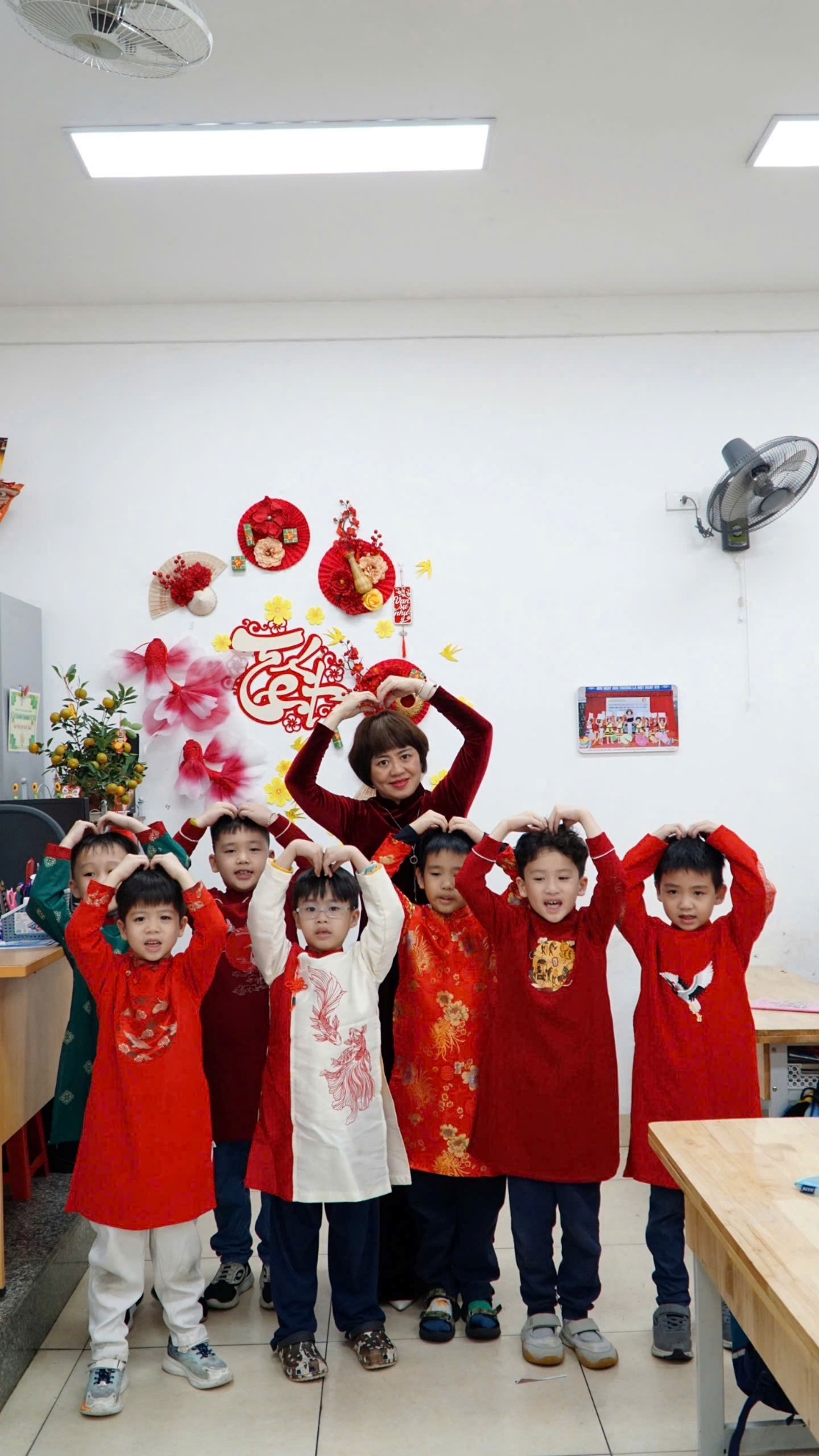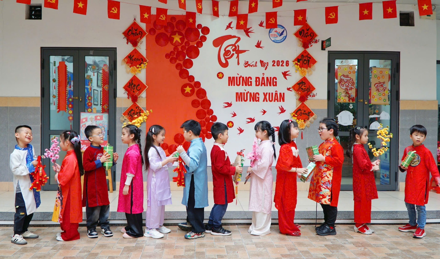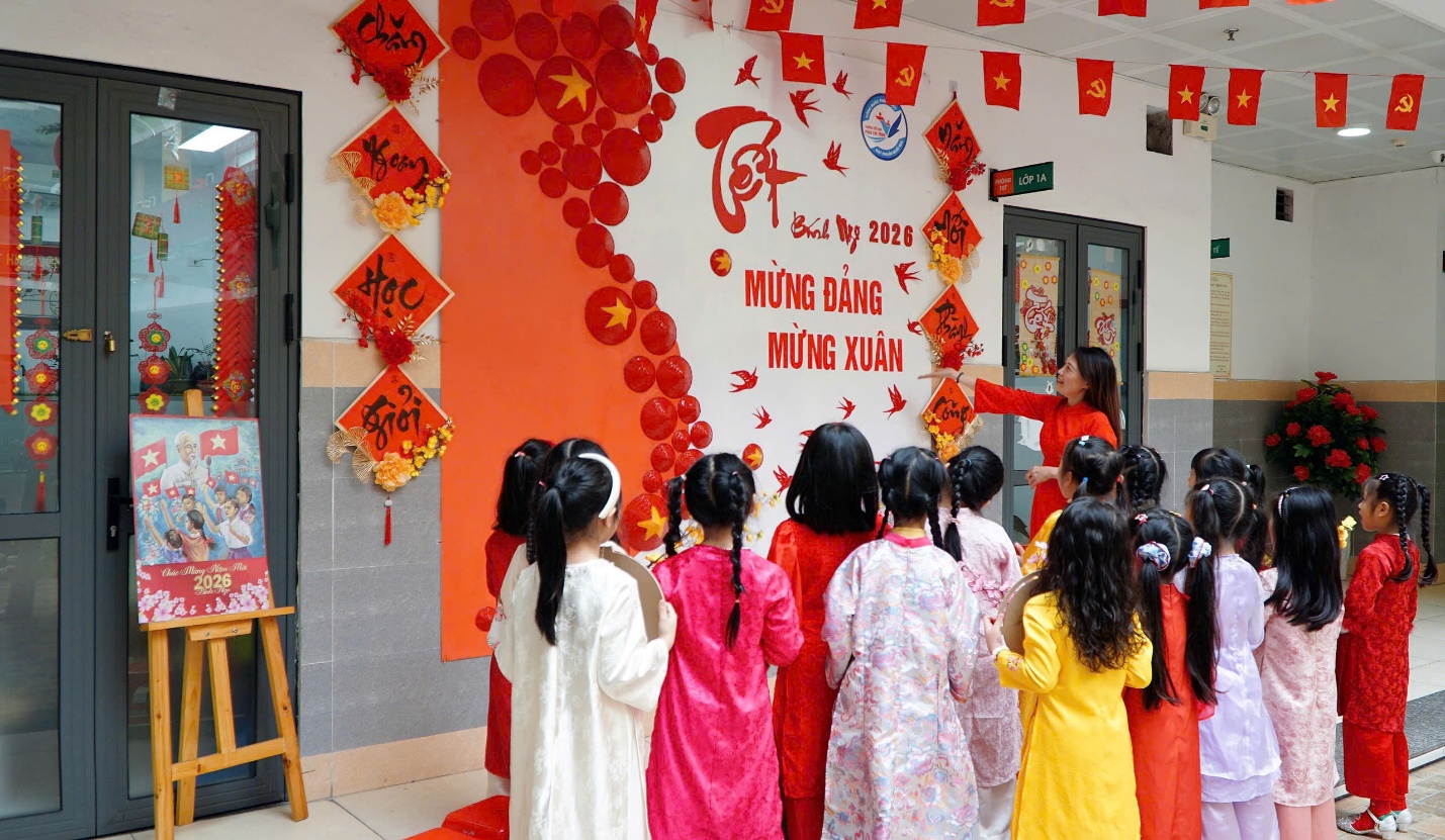 Trong chuỗi hoạt động chào xuân, các em học sinh khối lớp Một đã hào hứng tham gia nhiều hoạt động tập thể ý nghĩa như: sinh hoạt đầu xuân, chụp ảnh lưu niệm, xếp hình trái tim thể hiện tinh thần đoàn kết, yêu thương; trải nghiệm Tết cổ truyền trong trang phục áo dài, áo truyền thống cùng các đạo cụ quen thuộc như bao lì xì, bánh chưng, cành hoa xuân… Dưới sự hướng dẫn tận tình của các thầy cô giáo, các em thêm mạnh dạn, tự tin và cảm nhận rõ nét niềm vui của những ngày đầu năm mới.