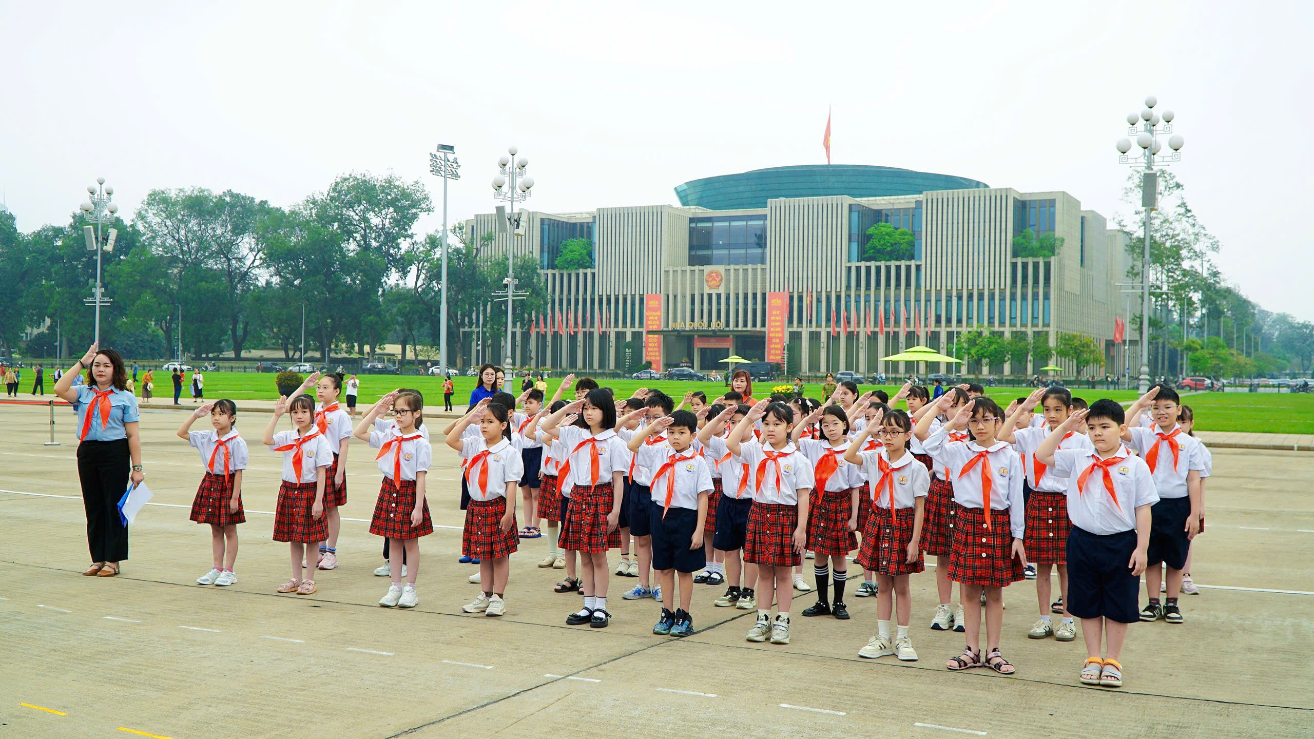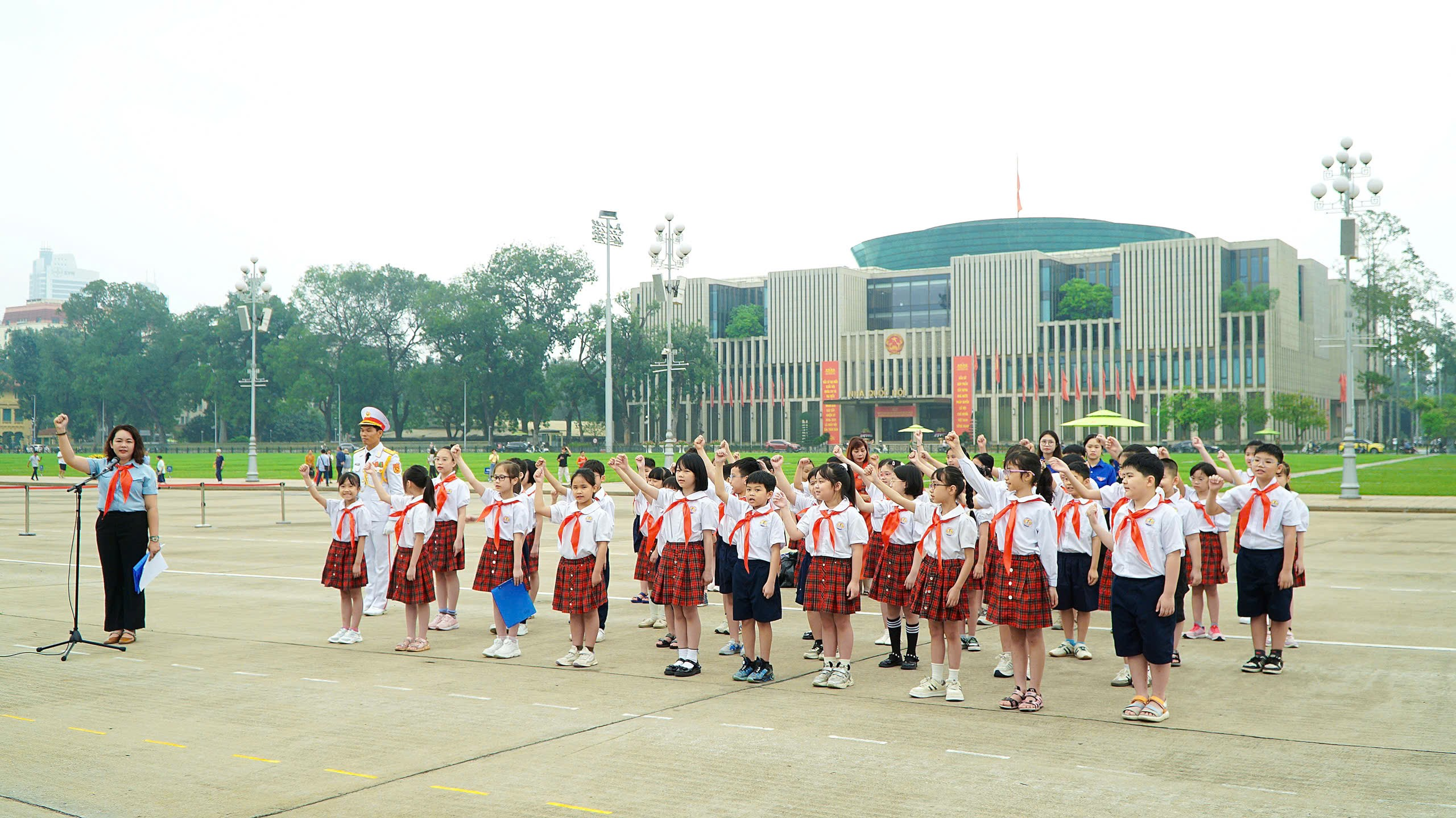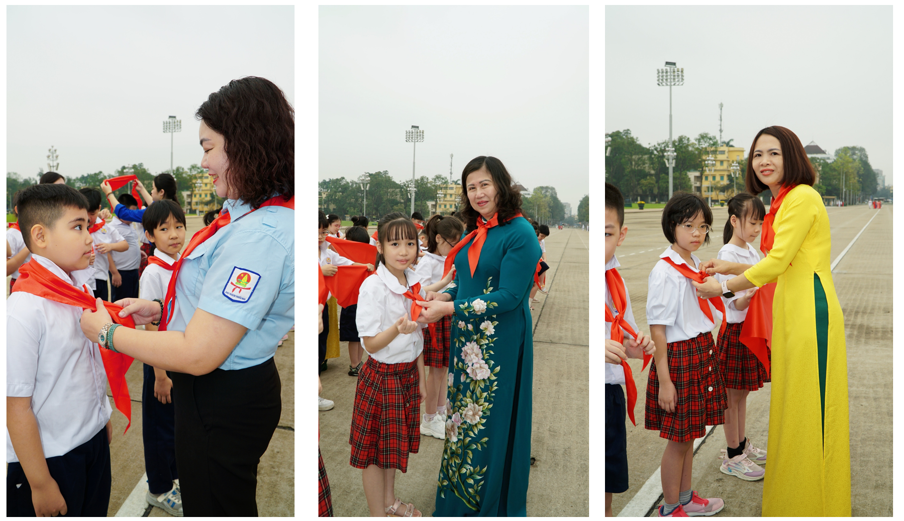 Sáng tháng Ba, nắng Ba Đình như vàng rực rỡ hơn để chào đón đoàn đại biểu nhà trường cùng các em học sinh. Khác hẳn với vẻ tinh nghịch thường ngày, các em hôm nay bỗng trở nên chững chạc lạ thường trong bộ đồng phục chỉnh tề, ánh mắt bạn nào cũng lấp lánh niềm vui xen lẫn sự hồi hộp và niềm tự hào khó tả. Đó là sự hãnh diện khi nỗ lực học tập suốt 3 năm qua được đền đáp bằng niềm vinh dự khi được đứng vào hàng ngũ của Đội TNTP Hồ Chí Minh ngay tại địa danh lịch sử này.