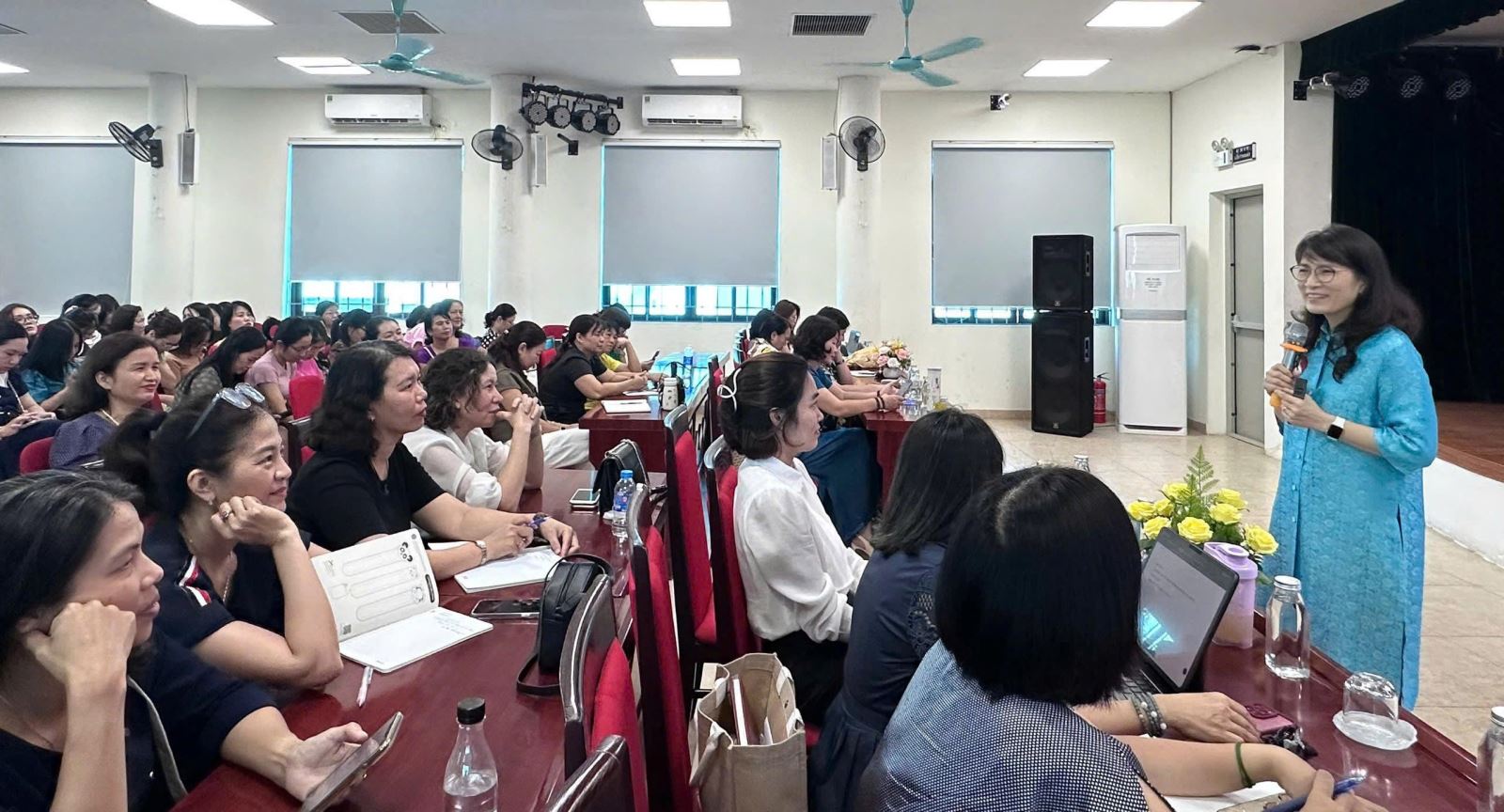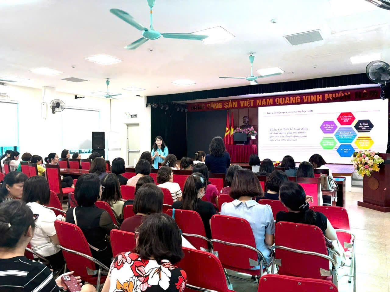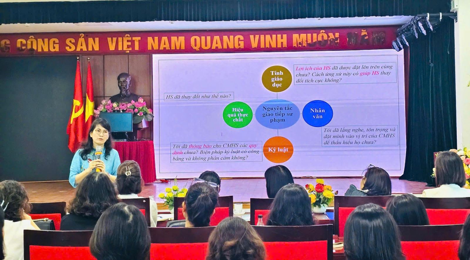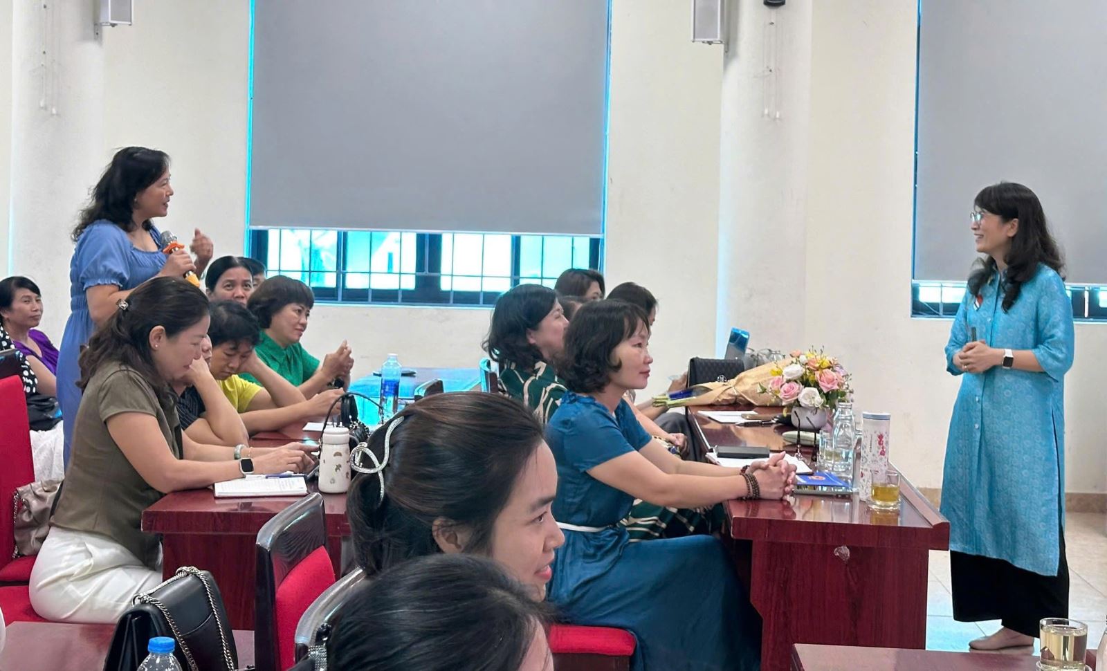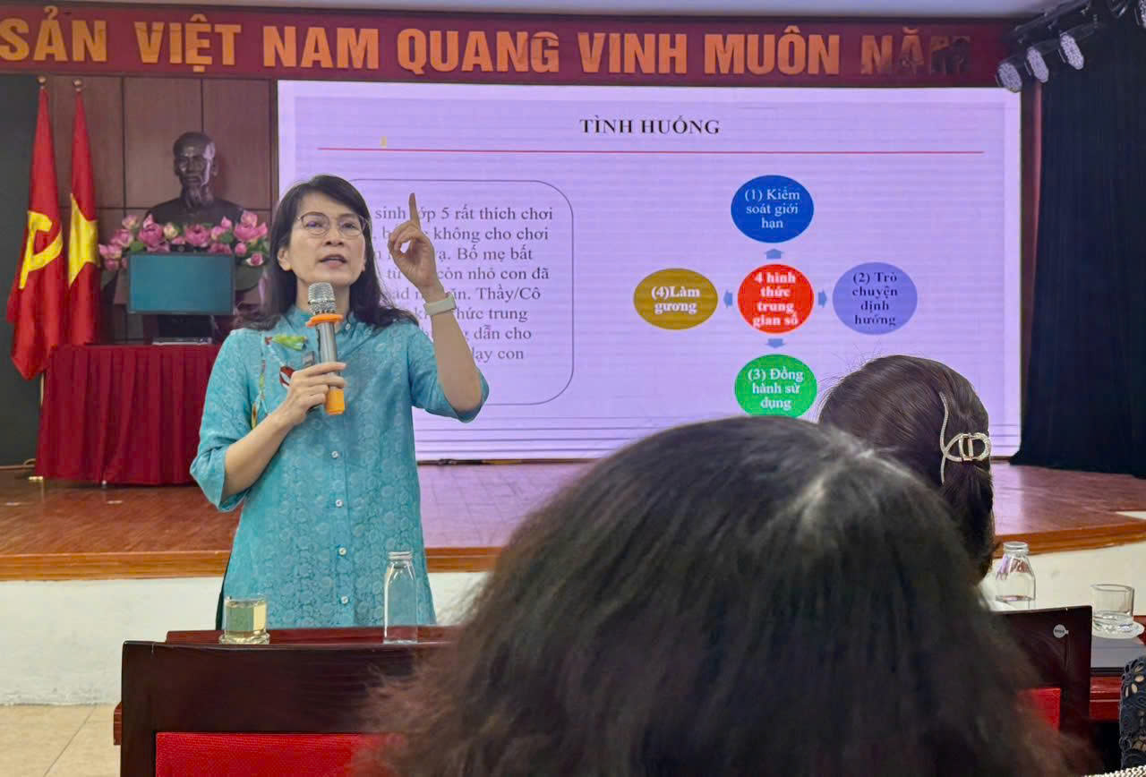 Buổi tập huấn đã diễn ra trong bầu không khí sôi nổi, cởi mở và vô cùng thiết thực. Với phong cách truyền đạt gần gũi, sâu sắc, Tiến sĩ Thu Anh đã mang đến nhiều giải pháp ứng xử, giao tiếp linh hoạt thực tế, cùng những bài học ý nghĩa về nghệ thuật lắng nghe, thấu hiểu và cách ứng xử tinh tế với phụ huynh học sinh trong bối cảnh chuyển đổi số. Các thầy cô giáo cũng có cơ hội trao đổi, chia sẻ kinh nghiệm, học hỏi lẫn nhau trong công tác quản lý, chủ nhiệm, giảng dạy và giáo dục học sinh.