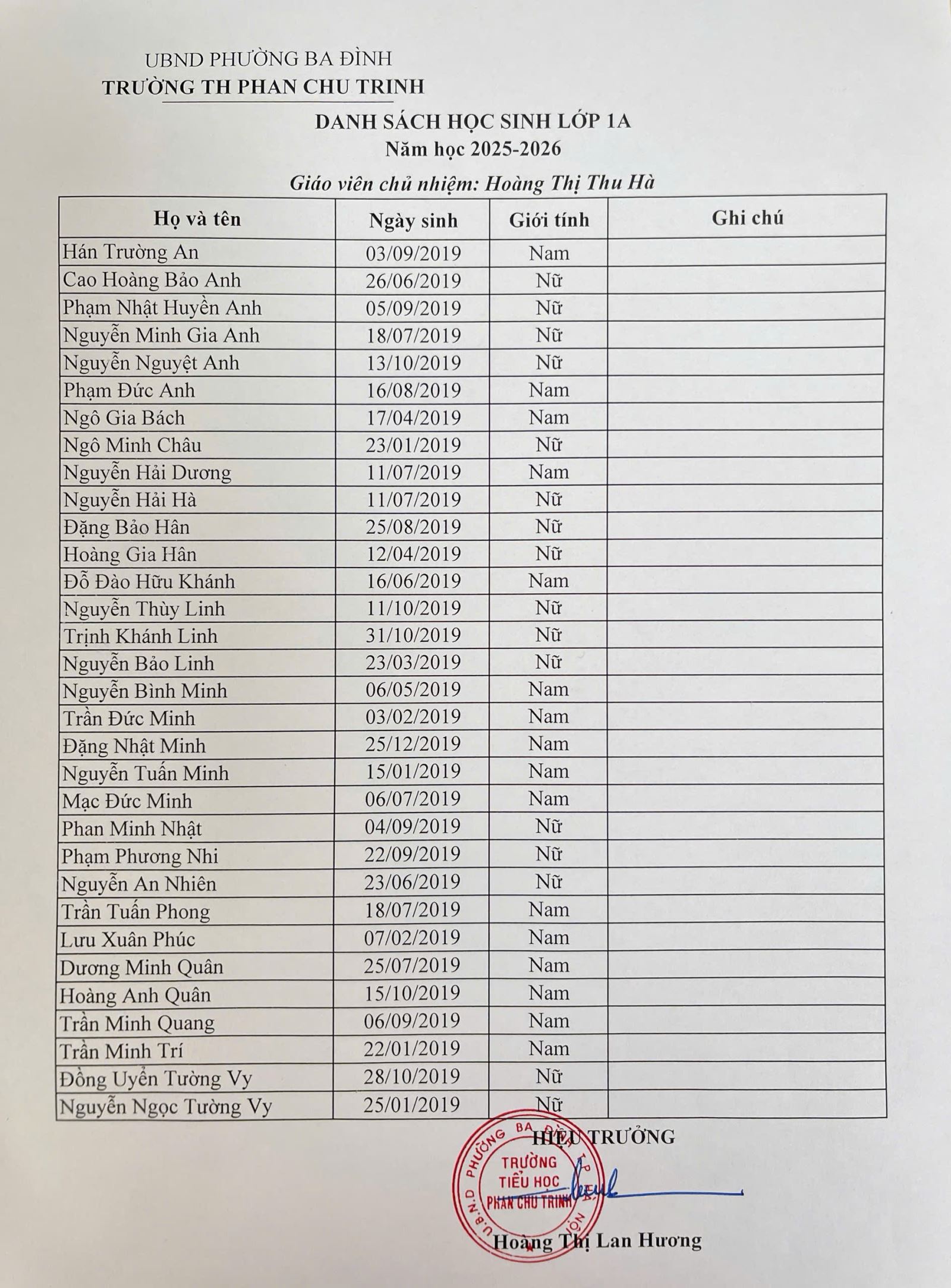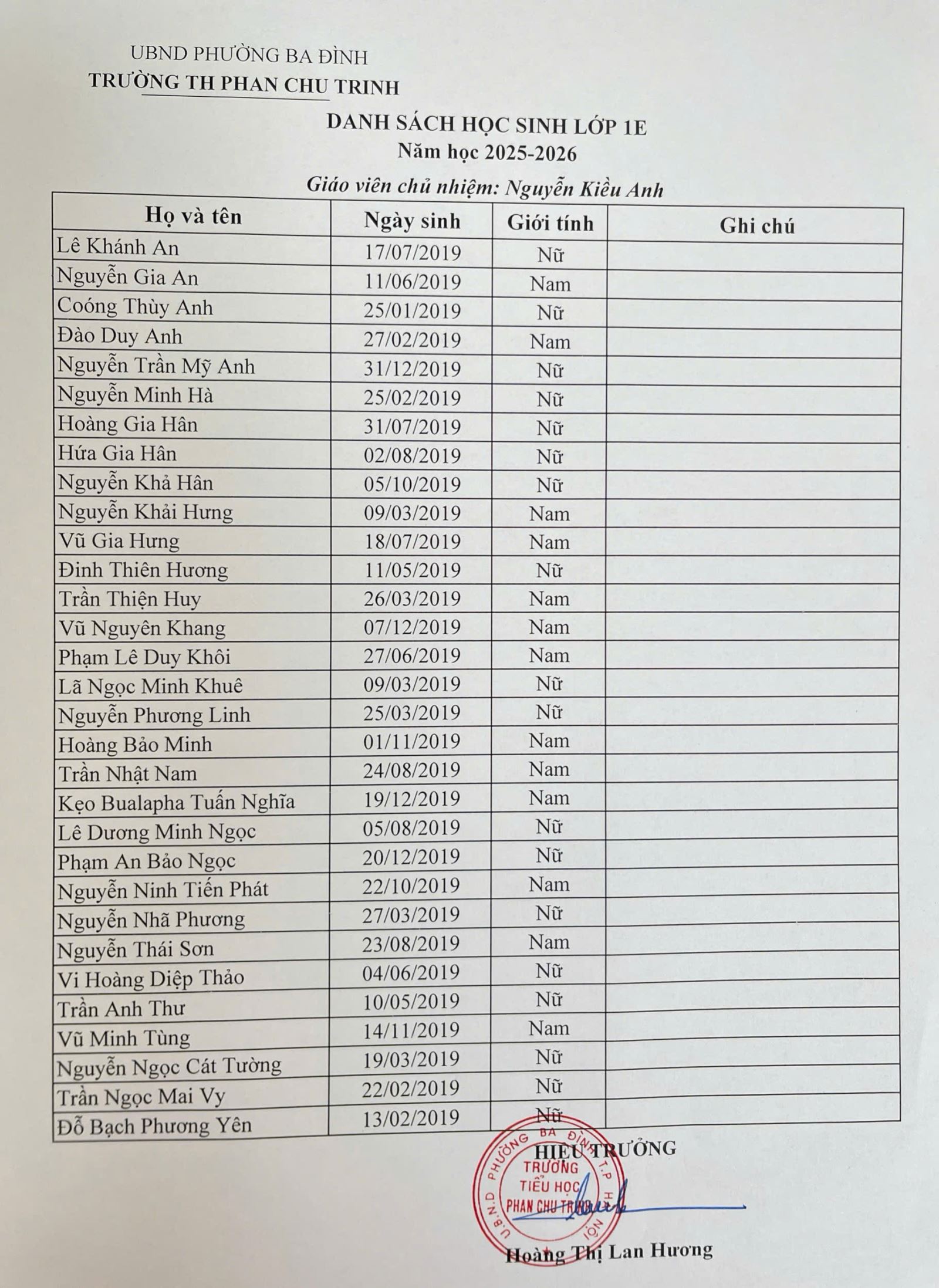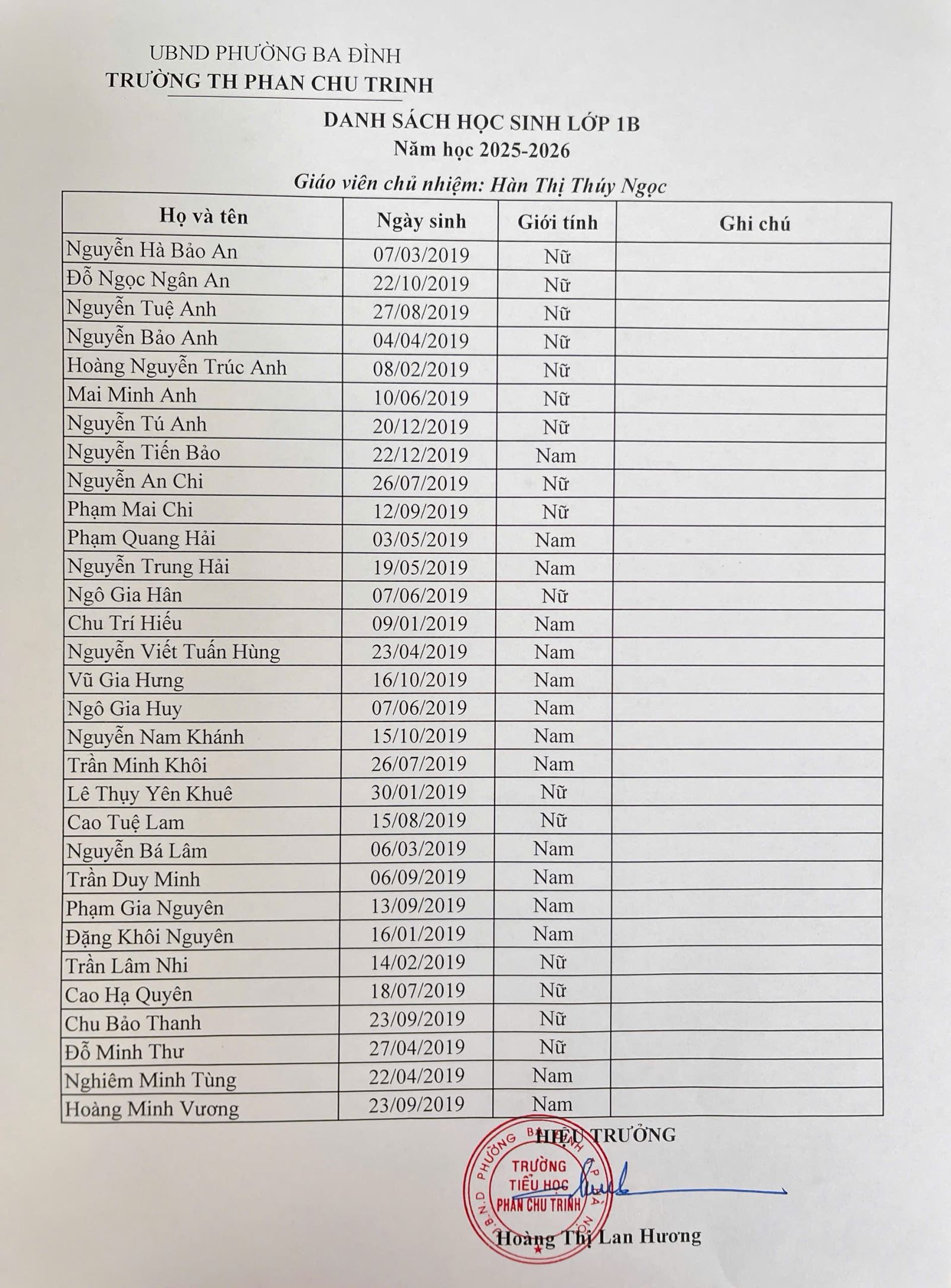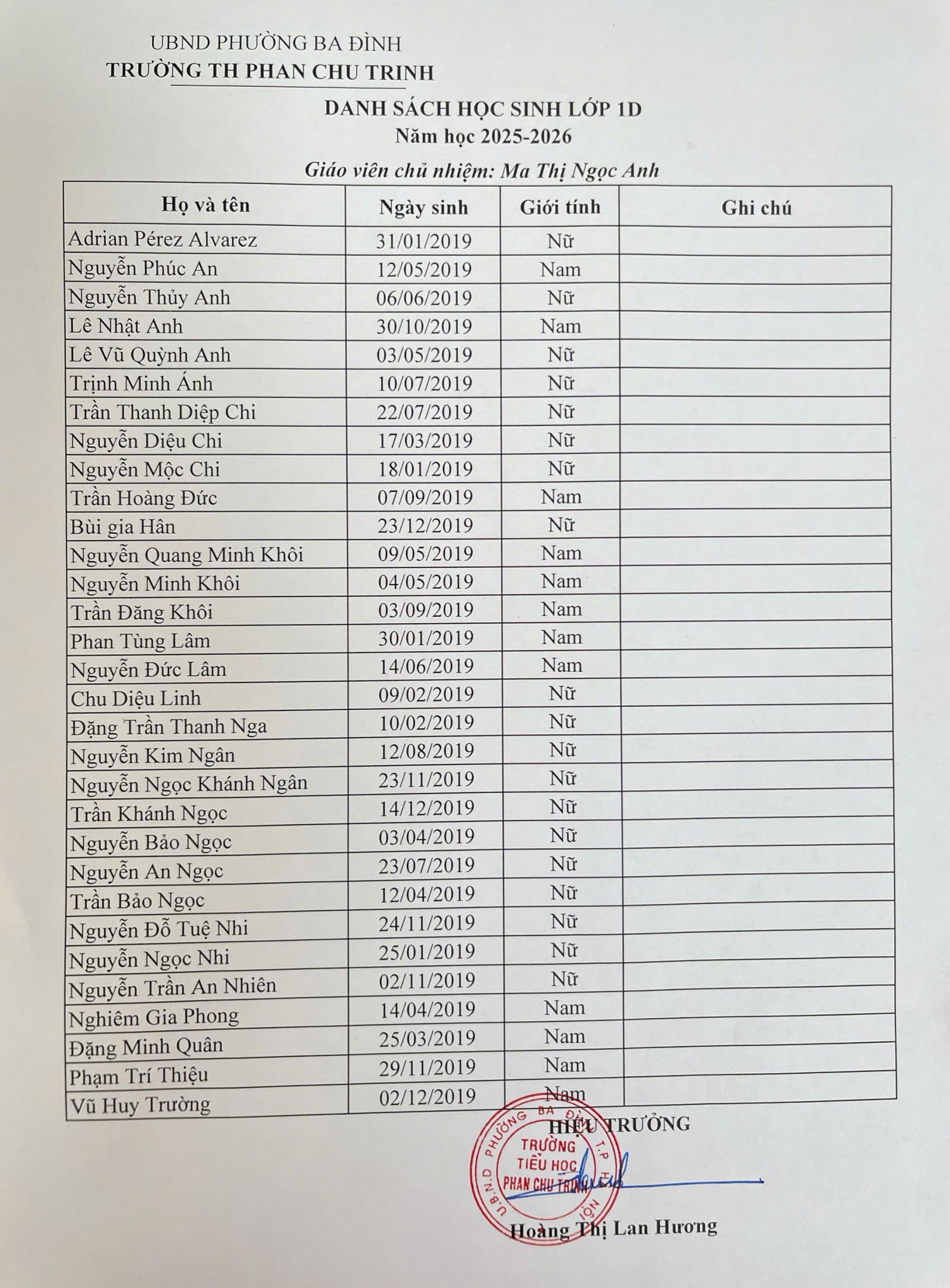 Trường TH Phan Chu Trinh thông báo danh sách học sinh lớp 1 - Năm học 2025 - 2026, cụ thể như sau: