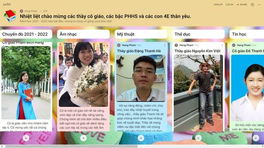 Padlet trở thành một công cụ hiệu quả trong công tác chủ nhiệm của mỗi giáo viên lớp 4. Ngay đầu năm học, cô giáo chủ nhiệm đã gửi tới toàn thể học sinh trong lớp hình ảnh và lời nhắn nhủ, chúc mừng của mình và các thầy, cô giáo bộ môn qua padlet. Các bạn học sinh lớp 4 cũng đã bước đầu biết sử dụng padlet để ghi lại những mục tiêu học tập của bản thân và kế hoạch thực hiện trong năm học mới, chủ động chia sẻ những suy nghĩ, mong muốn, ước mơ của mình với thầy cô và bạn bè.