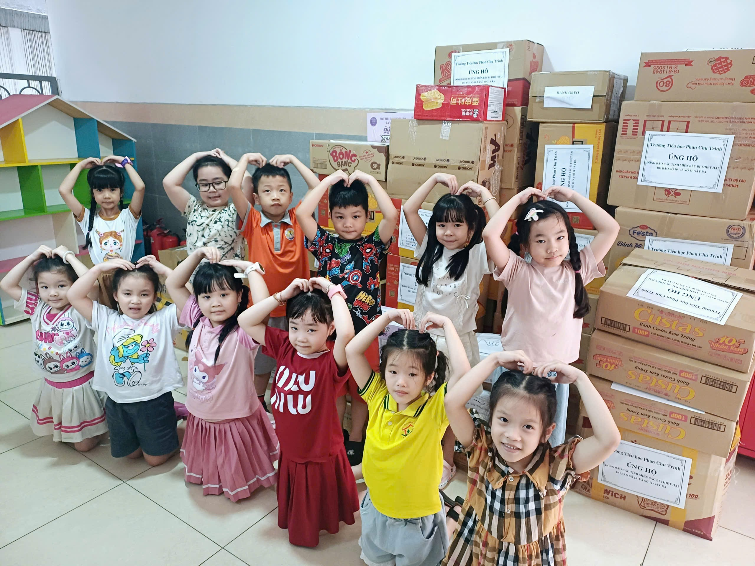 Hình ảnh các thầy cô, phụ huynh học sinh và học sinh cùng nhau chuyển hàng, sắp xếp từng thùng quà hay nụ cười rạng rỡ của các em nhỏ khi tạo hình trái tim bên cạnh những món quà là minh chứng sinh động cho tinh thần “Lá lành đùm lá rách”, cho bài học làm người giản dị mà sâu sắc được gieo trong mỗi tâm hồn học trò Tiểu học Phan Chu Trinh.