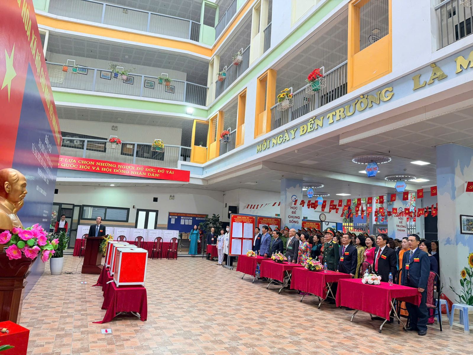 Ngay từ sáng sớm, khuôn viên trường Tiểu học Phan Chu Trinh đã rực rỡ sắc đỏ của cờ hoa, băng rôn, khẩu hiệu chào mừng ngày bầu cử. Không khí tại điểm bầu cử số 8 trở nên nhộn nhịp khi đông đảo cử tri trên địa bàn phường Ba Đình có mặt từ rất sớm để thực hiện quyền và nghĩa vụ thiêng liêng của mình.