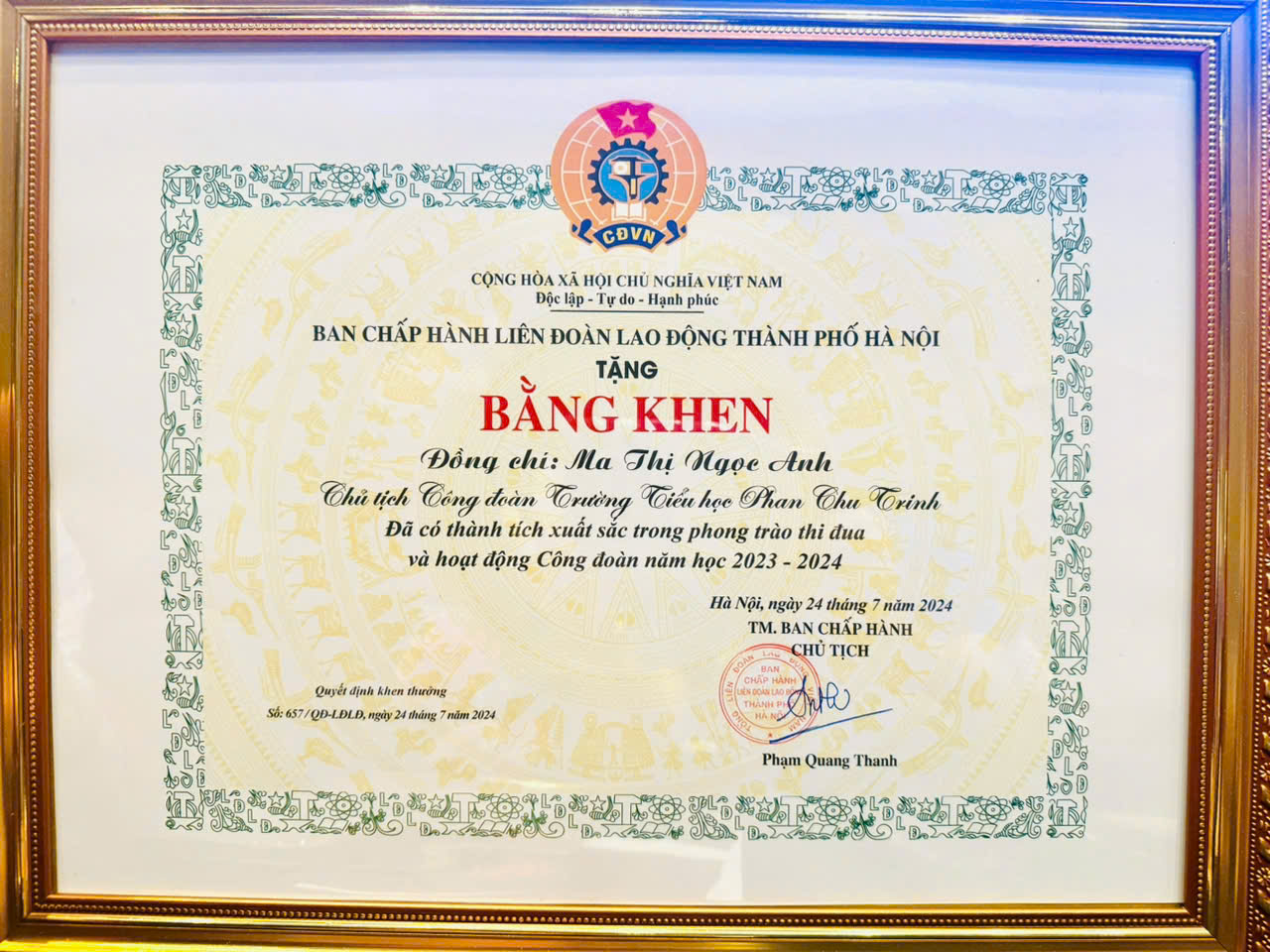 Đặc biệt, đồng chí Ma Thị Ngọc Anh - Chủ tịch Công đoàn Trường Tiểu học Phan Chu Trinh, đã vinh dự được nhận bằng khen cá nhân vì những đóng góp xuất sắc trong công tác Công đoàn. Đây không chỉ là niềm tự hào cho cá nhân đồng chí Ngọc Anh mà còn là động lực để tập thể cán bộ, giáo viên, nhân viên nhà trường tiếp tục phấn đấu, cống hiến vì sự phát triển chung của công đoàn trường và ngành giáo dục.