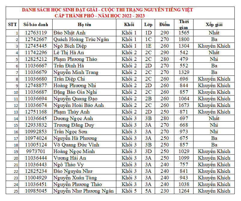 Trường Tiểu học Phan Chu Trinh thông báo danh sách học sinh đạt giải cuộc thi Trạng Nguyên Tiếng Việt cấp Thành phố năm học 2022 - 2023