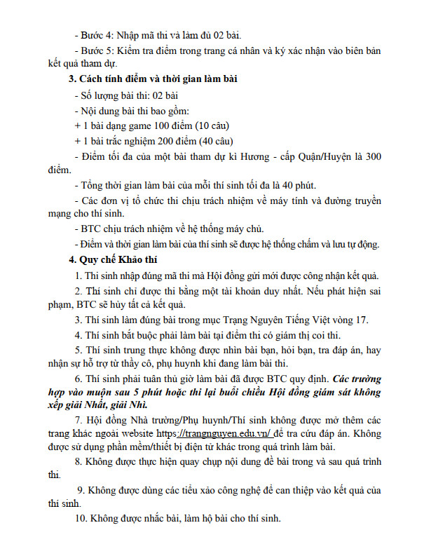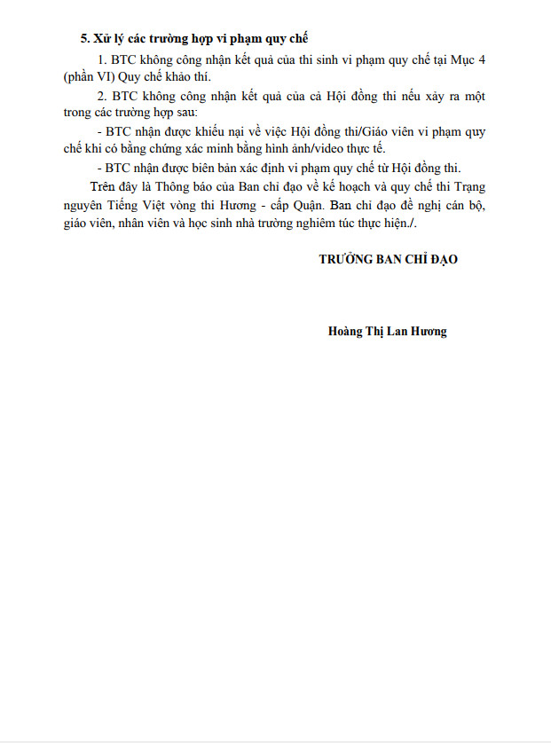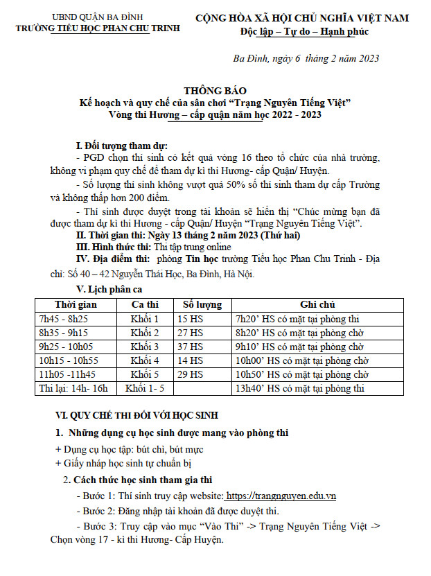 Trường TH Phan Chu Trinh thông báo kế hoạch và quy chế tổ chức sân chơi "Trạng Nguyên Tiếng Việt" vòng thi Hương - cấp Quận/ Huyện năm học 2022 - 2023: