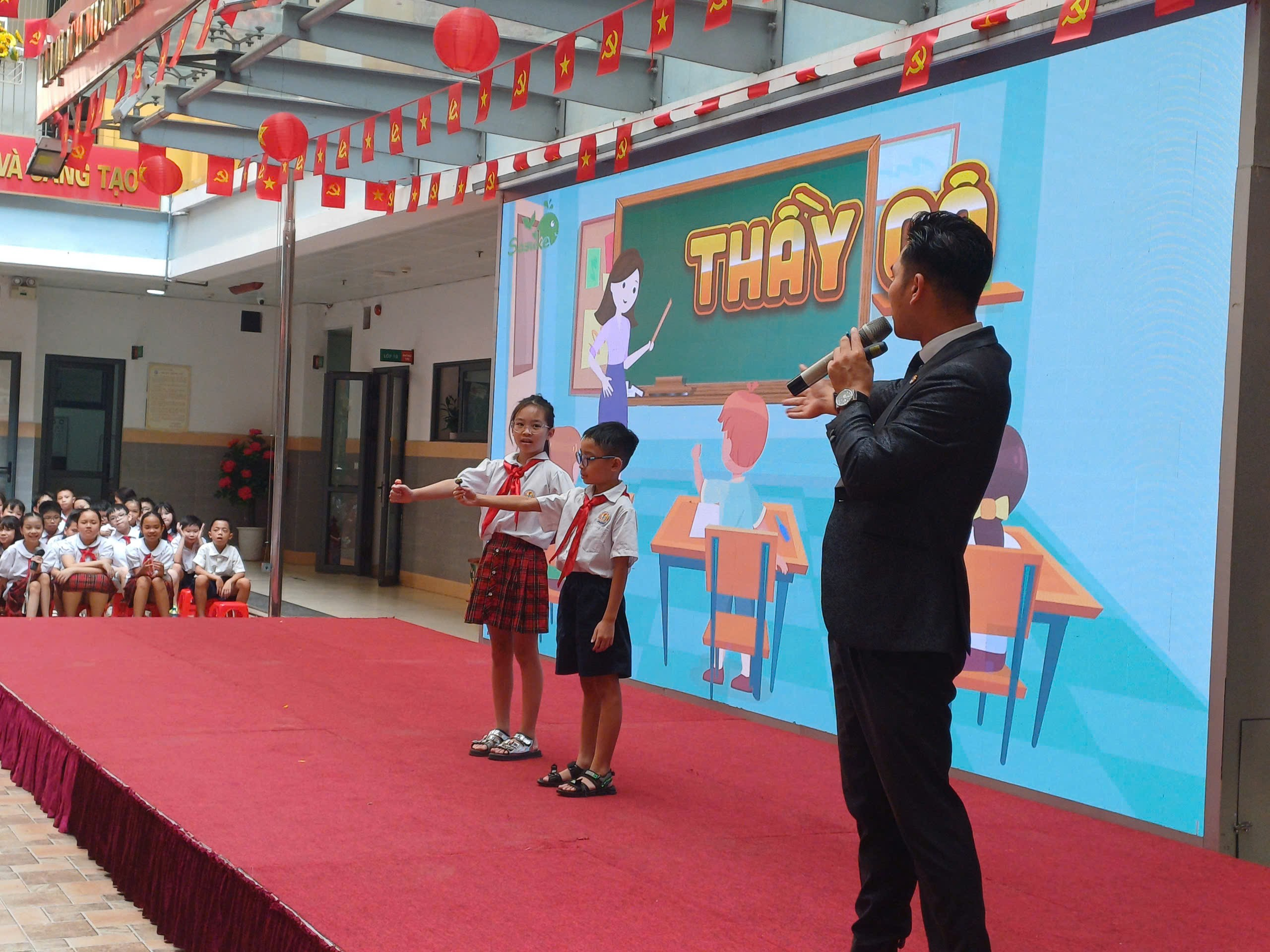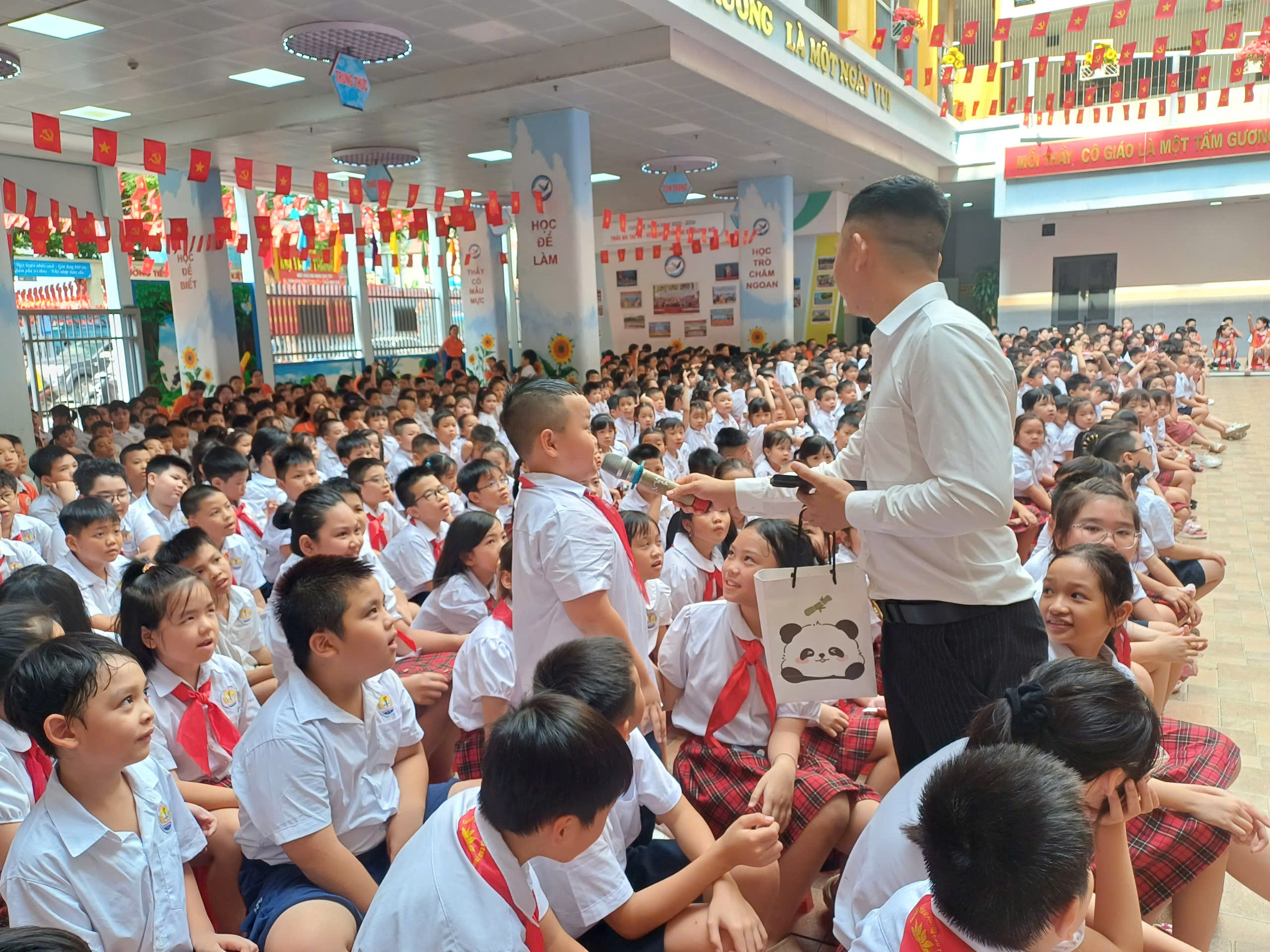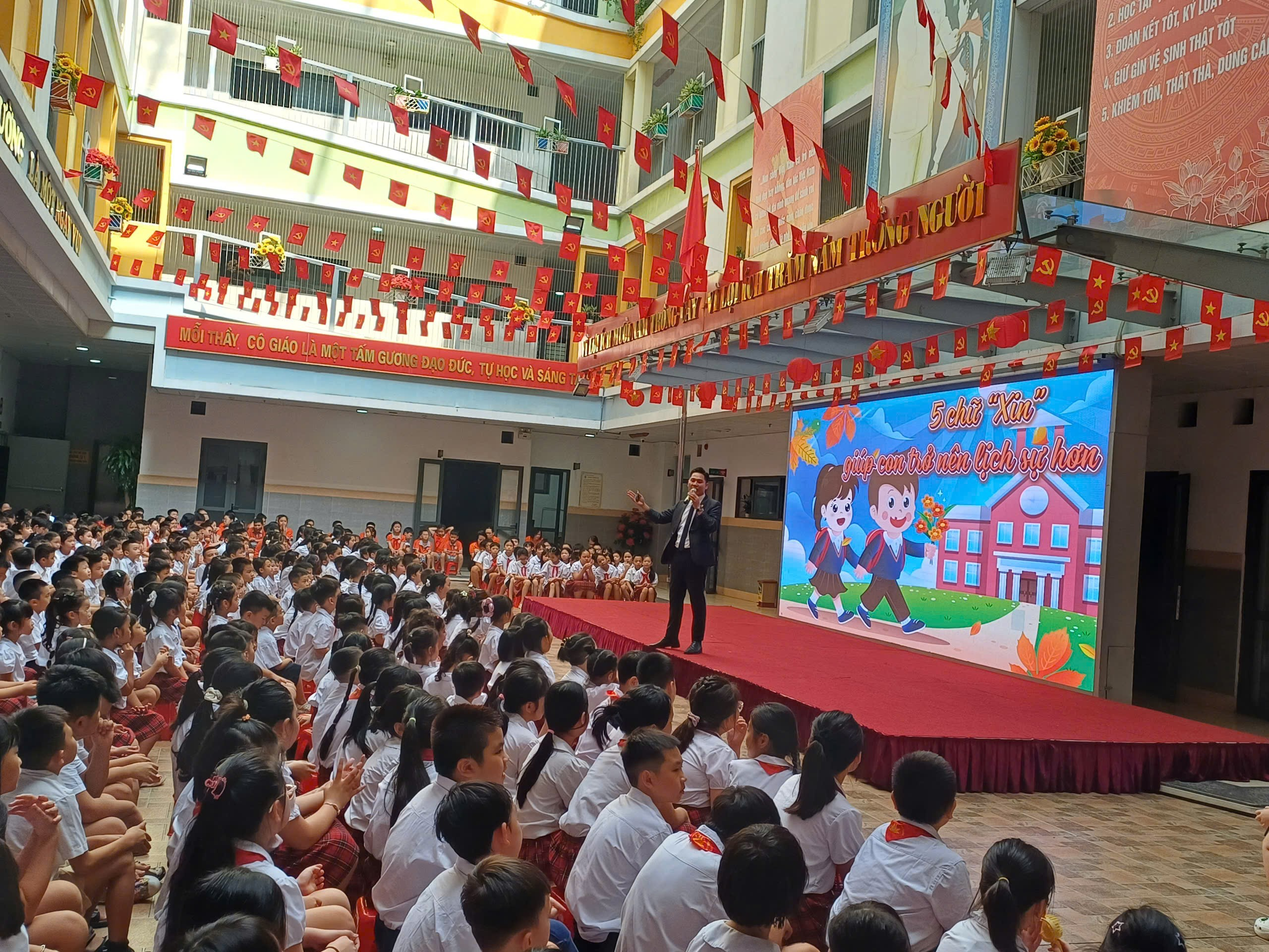 Sau lễ chào cờ đầu tuần, cô Trần Huyền Nhung – GV tổng phụ trách nhà trường tuyên dương các lớp, biểu dương các cá nhân thành tích đã đạt được trong tuần và phối hợp với Sasuke Việt Nam triển khai chuyên đề " Hành trang tuổi học trò " với những kiến thức, kỹ năng quan trọng để bản thân trở thành HS thanh lịch, văn minh. Giúp các em học sinh ghi nhớ và áp dụng những kiến thức quan trọng cũng như luôn ý thức phấn đấu học tập tốt để trở thành con ngoan, trò giỏi, cháu ngoan Bác Hồ.