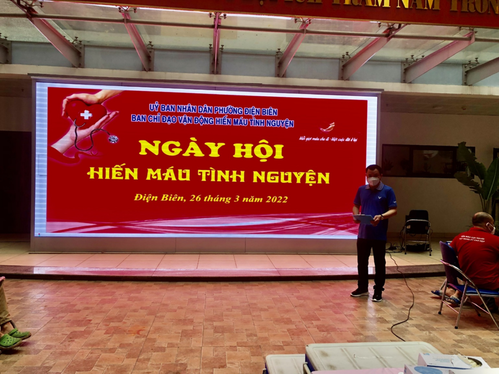 Để lan tỏa nghĩa cử cao đẹp và ý nghĩa nhân văn của hành động đó, ngày 26/3/2022, tại địa điểm Trường TH Phan Chu Trinh, UBND phường Điện Biên đã tổ chức Chương trình Hiến máu tình nguyện với thông điệp: “MỘT GIỌT MÁU CHO ĐI, MỘT CUỘC ĐỜI Ở LẠI”. Đây là hoạt động ý nghĩa và thiết thực, góp phần làm giàu thêm nguồn máu dự trữ để sẵn sàng phục vụ cho những người bệnh.