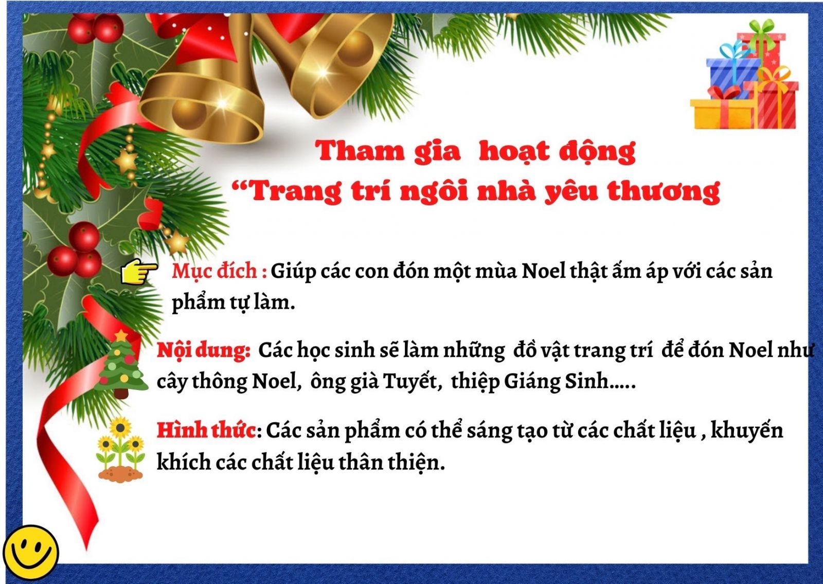 Hãy cùng thầy cô và các bạn tham gia hoạt động “ Trang trí ngôi nhà yêu thương”  để cùng Đón Noel – Chào năm mới 2022  với những đồ vật trang trí hoàn toàn do các con tự làm, sáng tạo từ các chất liệu để sáng tạo ra các sản phẩm của mình.
