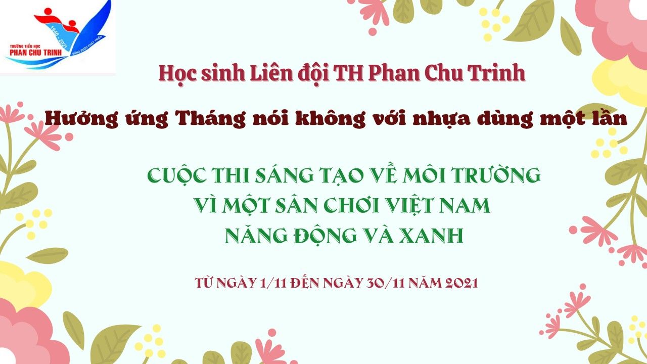 Do ảnh hưởng của dịch Covid-19, nhu cầu sử dụng đồ nhựa dùng một lần tăng nhanh. Điều này không chỉ ảnh hưởng nghiêm trọng đến môi trường mà còn nguy hại cho sức khỏe con người. Liên đội trường TH Phan Chu Trinh đã phát động tới các em học sinh “Tháng nói không với nhựa dùng một lần” và Cuộc thi Sáng tạo về môi trường Vì một sân chơi Việt Nam năng động và xanh để giúp các em hiểu rõ vấn nạn rác thải nhựa hiện nay.